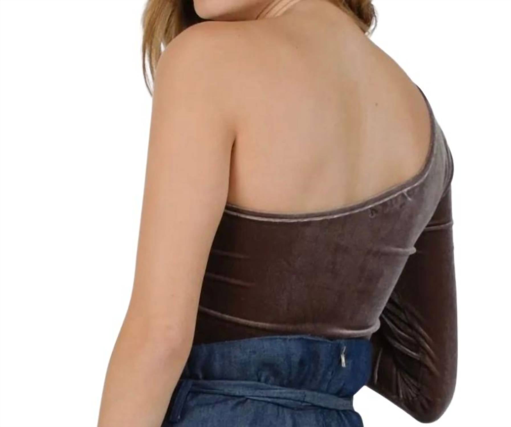 One-shoulder with a sleek, fitted design. Long sleeve on one side for an asymmetrical, modern silhouette.