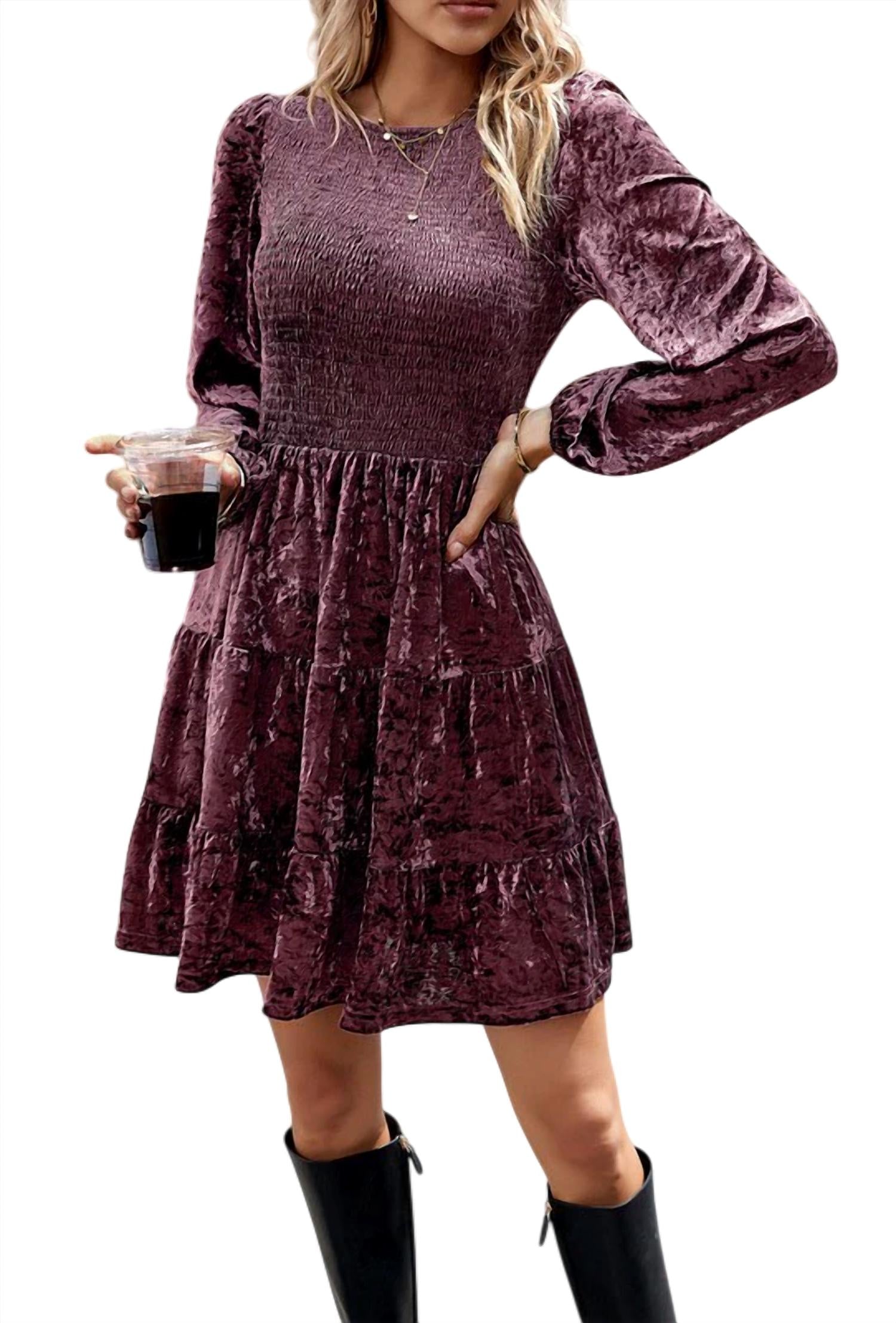 Elevate your holiday wardrobe with the Lexie Smocked Velvet Dress from Miss Sparkling. Featuring long sleeves and a crewneck, this stylish dress offers a textured fit and flare silhouette that falls into the mini category. The luxurious velvet fabric and smocked bodice ensure a true-to-size fit, with a convenient pull-on closure. Perfect for any festive occasion, this mauve dress promises to turn heads.