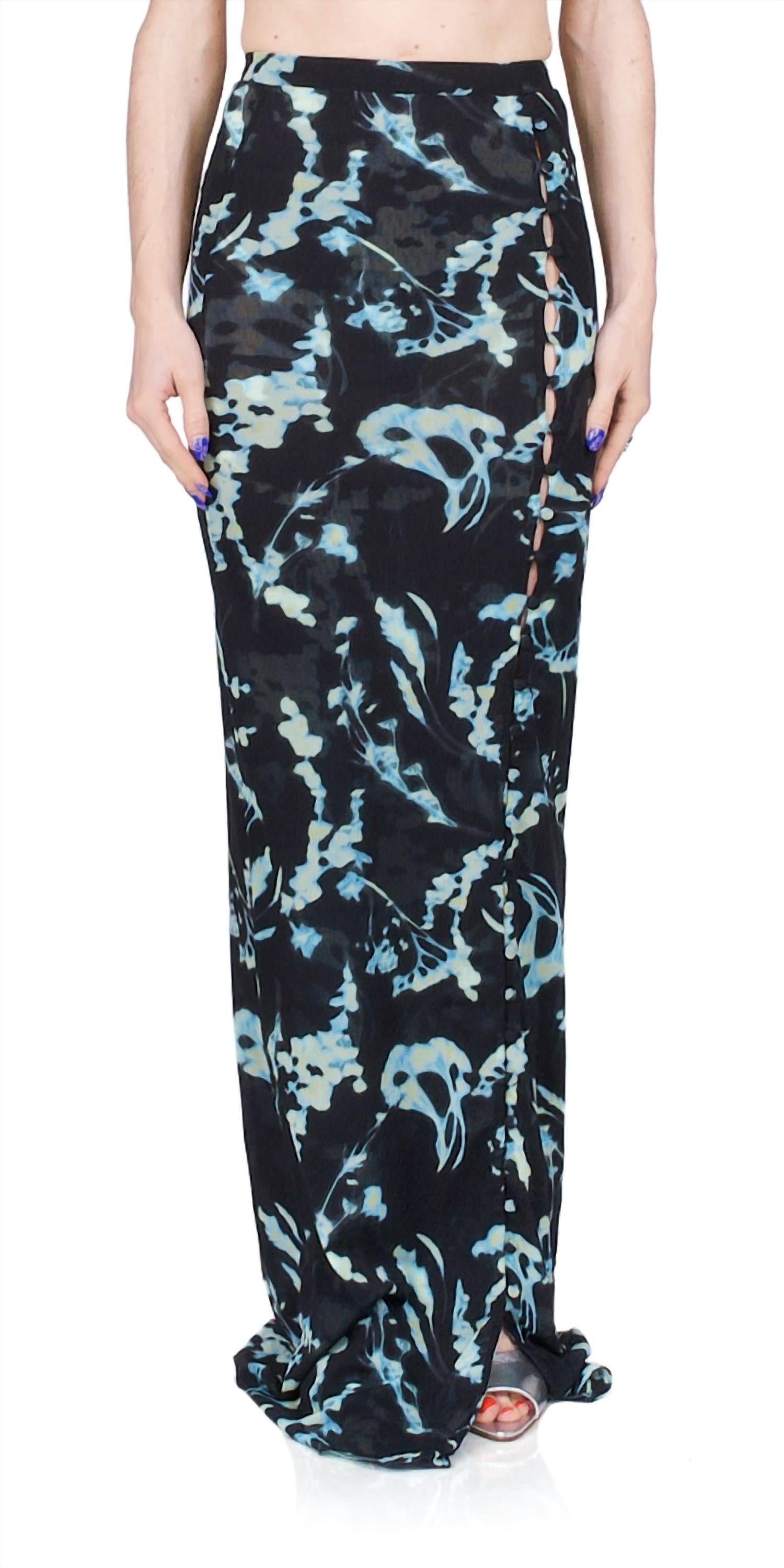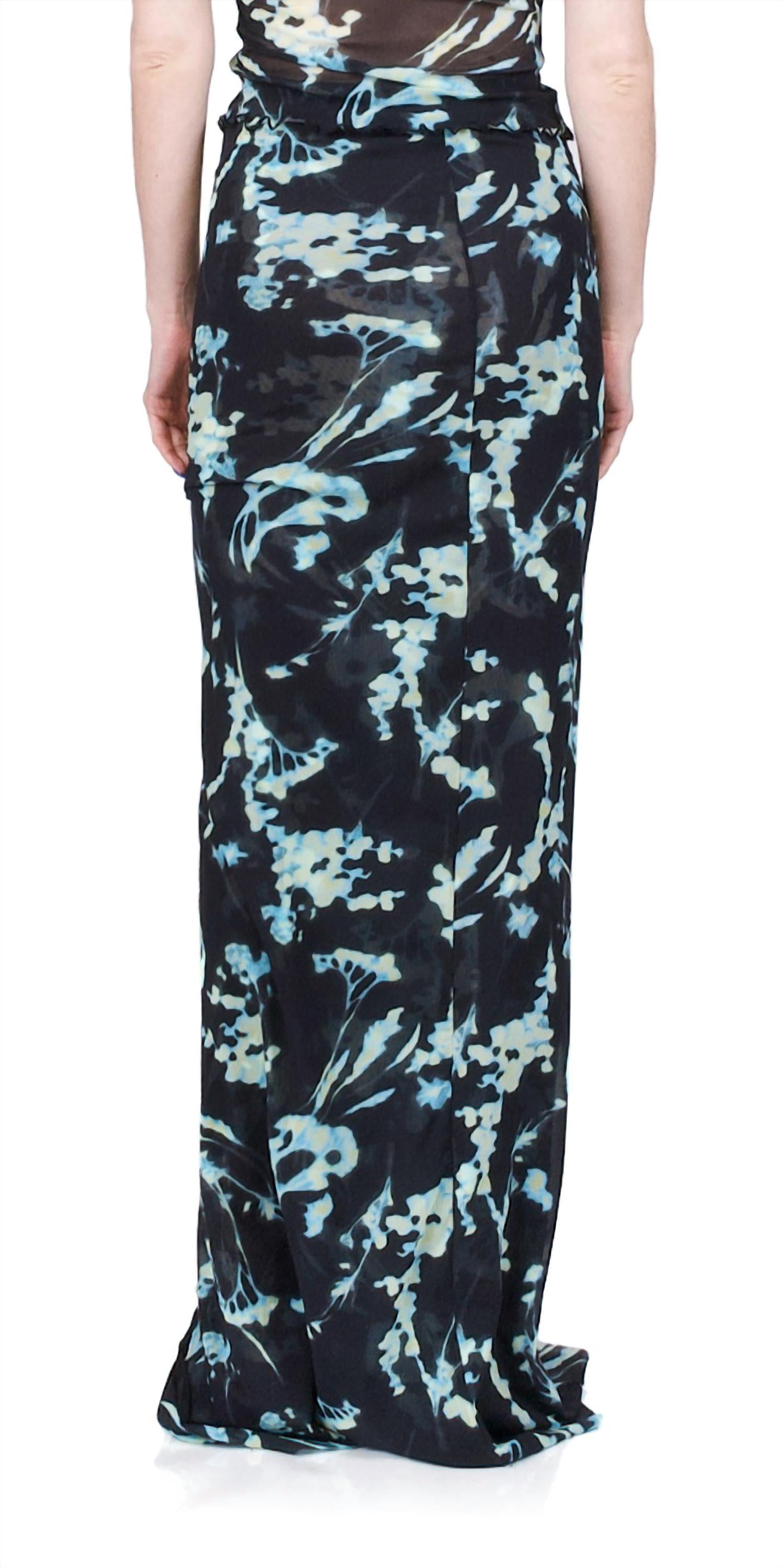 Tuck in your favorite tee for a more casual yet feminine look. Elevate your style with the PRISCAVera Mesh Button Down Maxi Skirt in a captivating Phantom Flower print. This floor-length skirt is crafted from a semi-sheer stretch Italian mesh, composed of 77% Polyamide and 23% Elastane, offering a blend of elegance and comfort. Featuring an elastic waistband and hand-covered buttons, the skirt provides versatility with a three-quarter button opening from thigh to hem. With its true-to-size fit, this skirt is a sophisticated addition to any wardrobe.