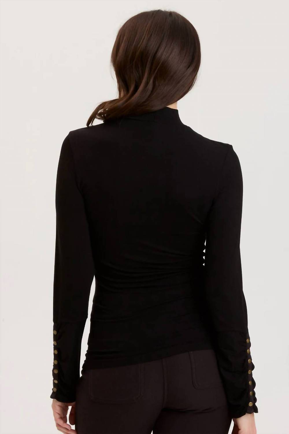 Layer under your favorite sweater or wear tucked into jeans for a perfectly polished winter look. Introducing the Ainsley Turtleneck Top by XCVI, a stylish addition to any wardrobe in classic midnight black. Featuring long sleeves with intricate ruched details and dome rivets, this turtleneck is perfect for layering. Made from 100% Viscose Camari Crepe, it offers a close fit and measures approximately 24 inches in length. Closure: Pull on. Care: Preshrunk and machine washable, ensuring ease of maintenance.