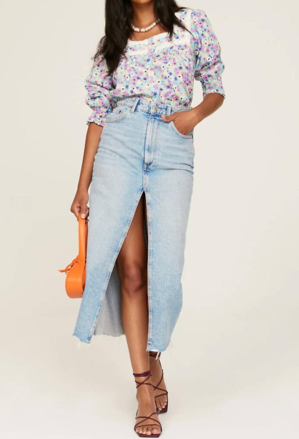 A timeless blouse that will never go out of style. Elevate your summer wardrobe with the Sedona Blouse by RIXO, featuring a square neckline and three-quarter sleeves that bring a touch of elegance to any vacation ensemble. Crafted from 100% multicolored floral cotton, this lilac-hued blouse embodies a maximalist trend while offering a textured finish. With a convenient front button closure, it blends style and practicality seamlessly. Care instructions are not specified, providing you with versatile wearing options.