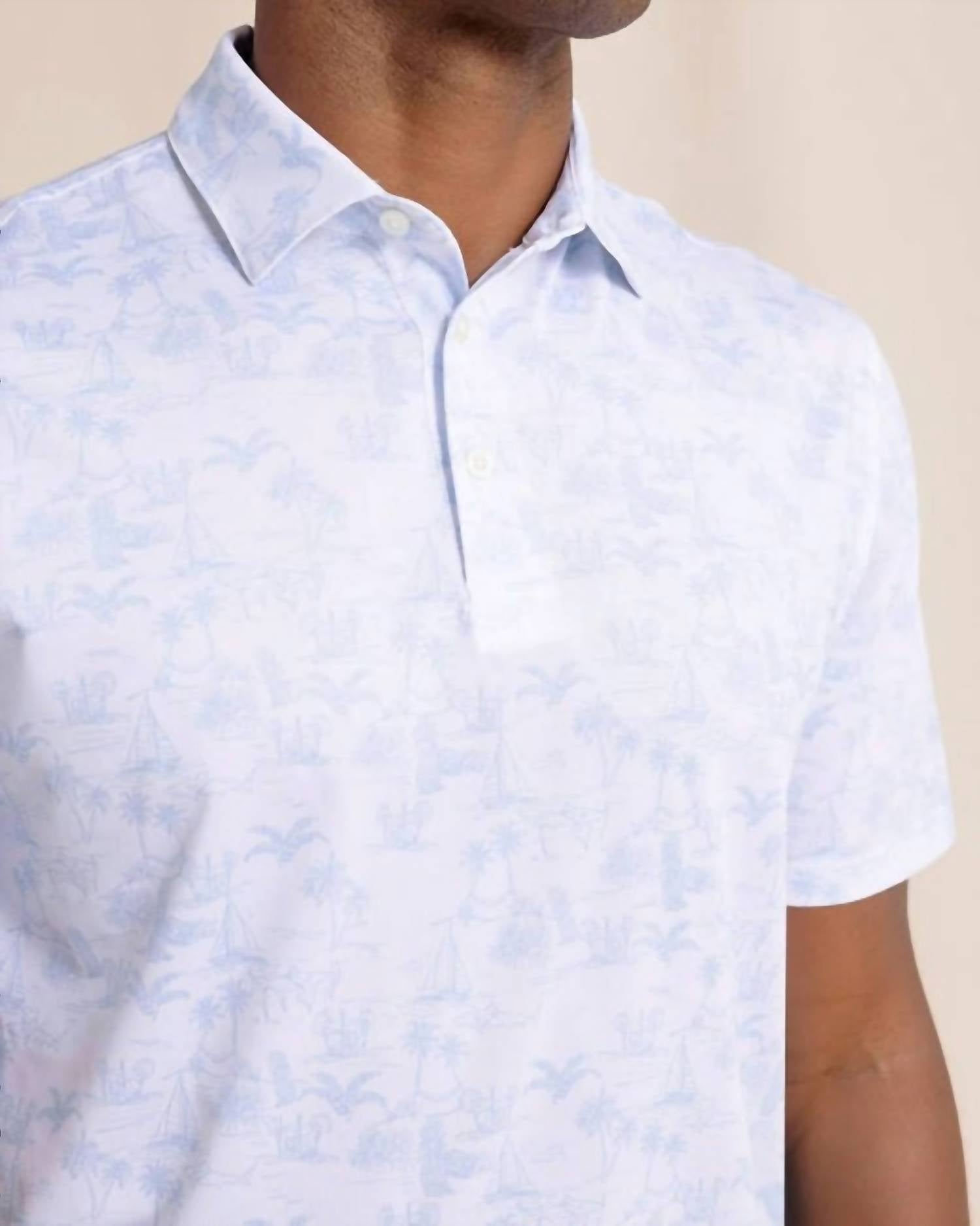 Enhance your wardrobe with our patterned polo shirt, which features a subtle tropical style. It has a self-collar, a three-button placket, and internal collar stays, all of which contribute to a classic polo look. Made from premium performance materials, this shirt keeps you breathable and comfortable from day to dusk. Wicking. Stretch. UV Protection. More Responsible Materials The model is 6'1" and wearing a size medium Machine Wash