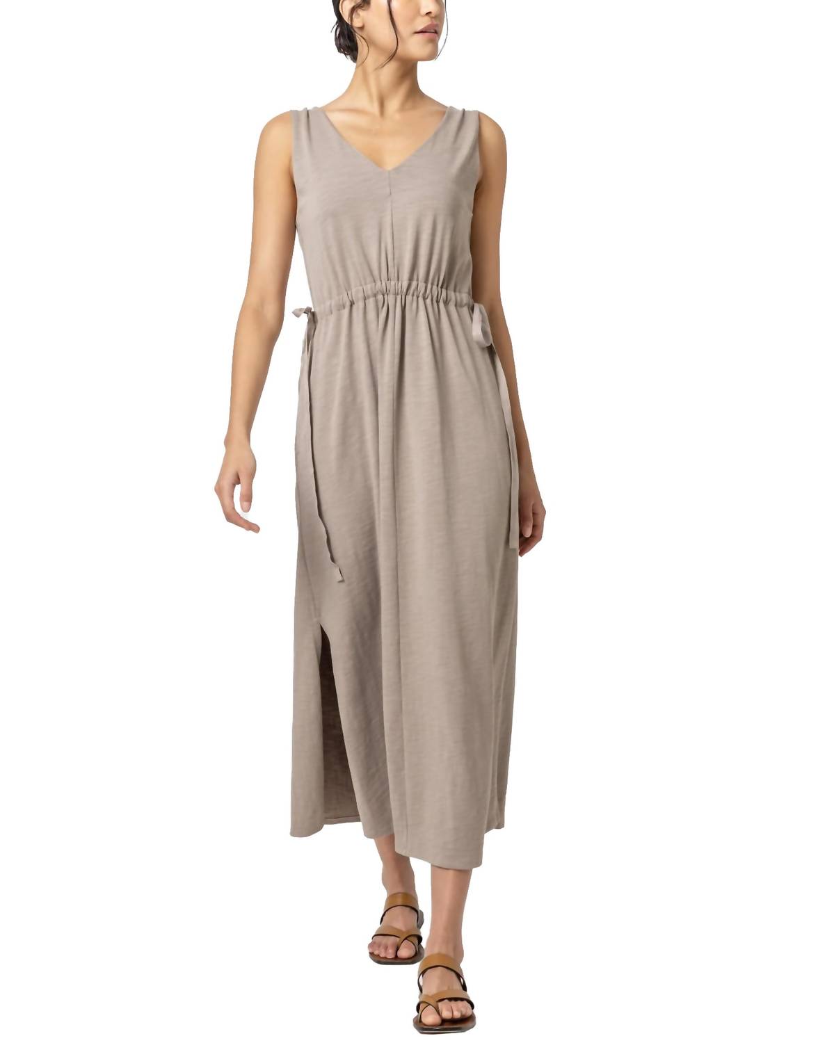This Driftwood Drawcord Waist Maxi Dress is crafted from 100% cotton, featuring a sleeveless A-line silhouette and a V-neckline. The drawcord waist allows for a customizable fit, enhancing your shape, and the fabric is machine washable for easy care.