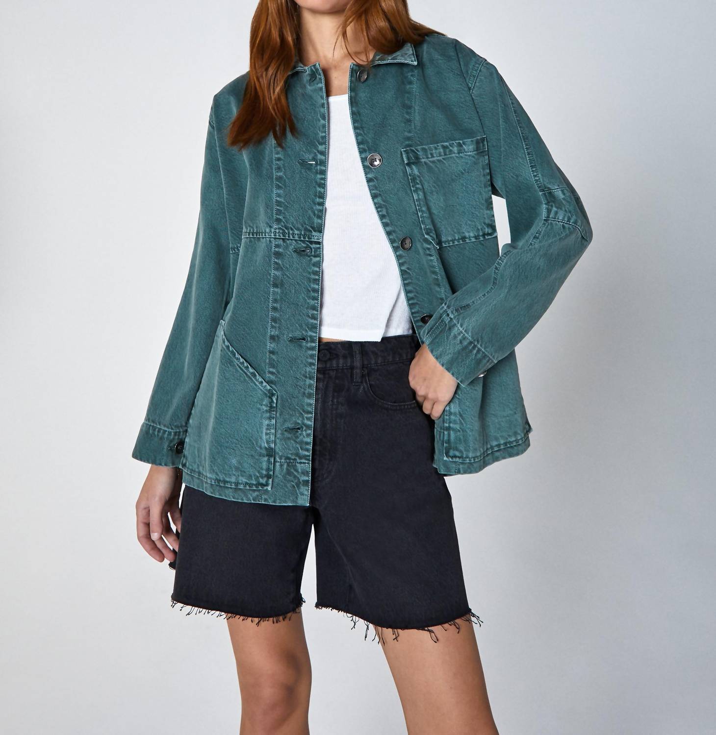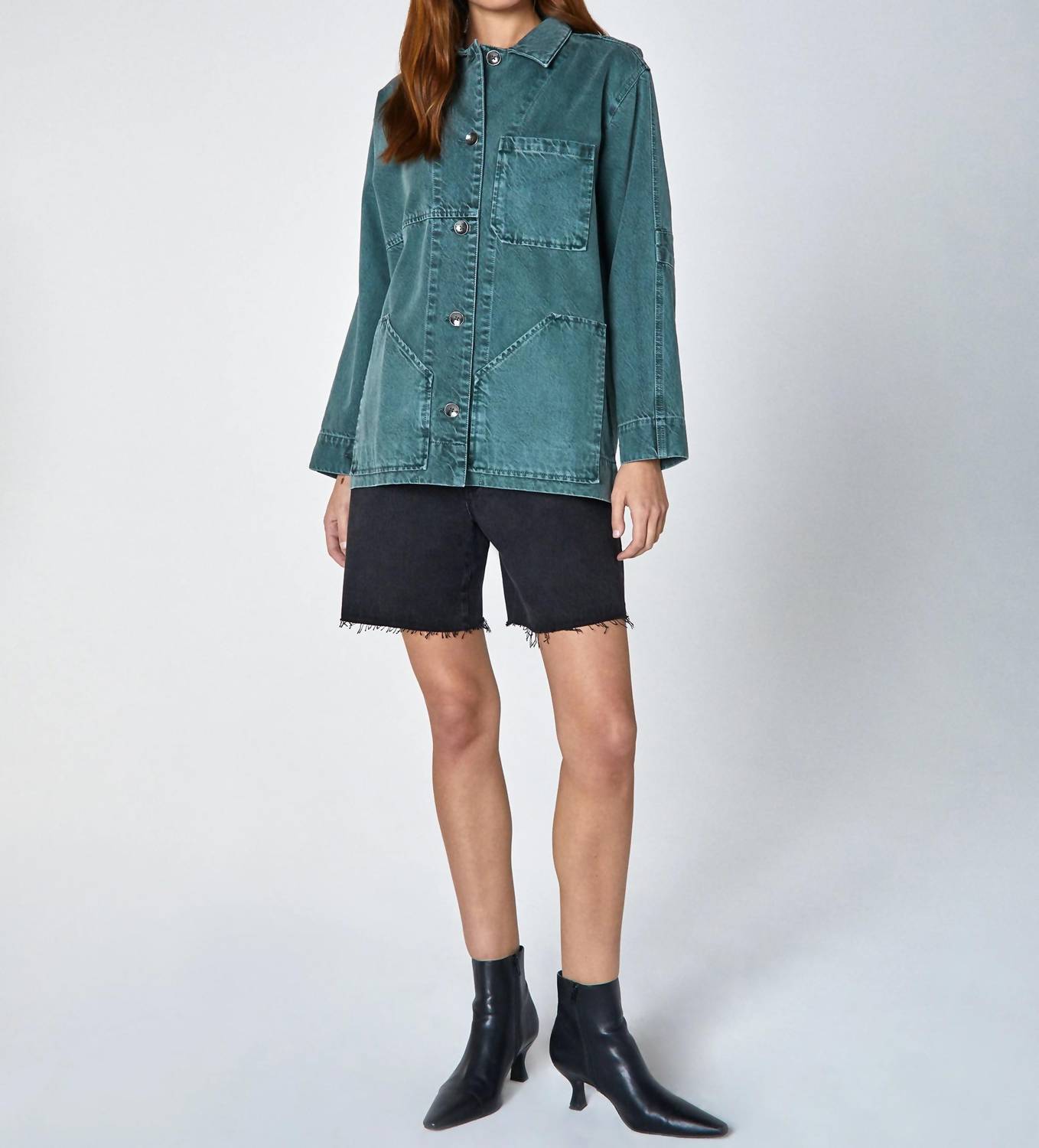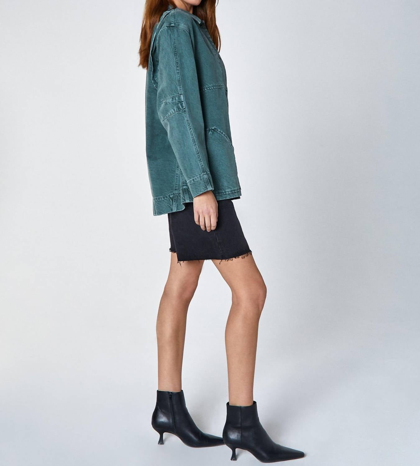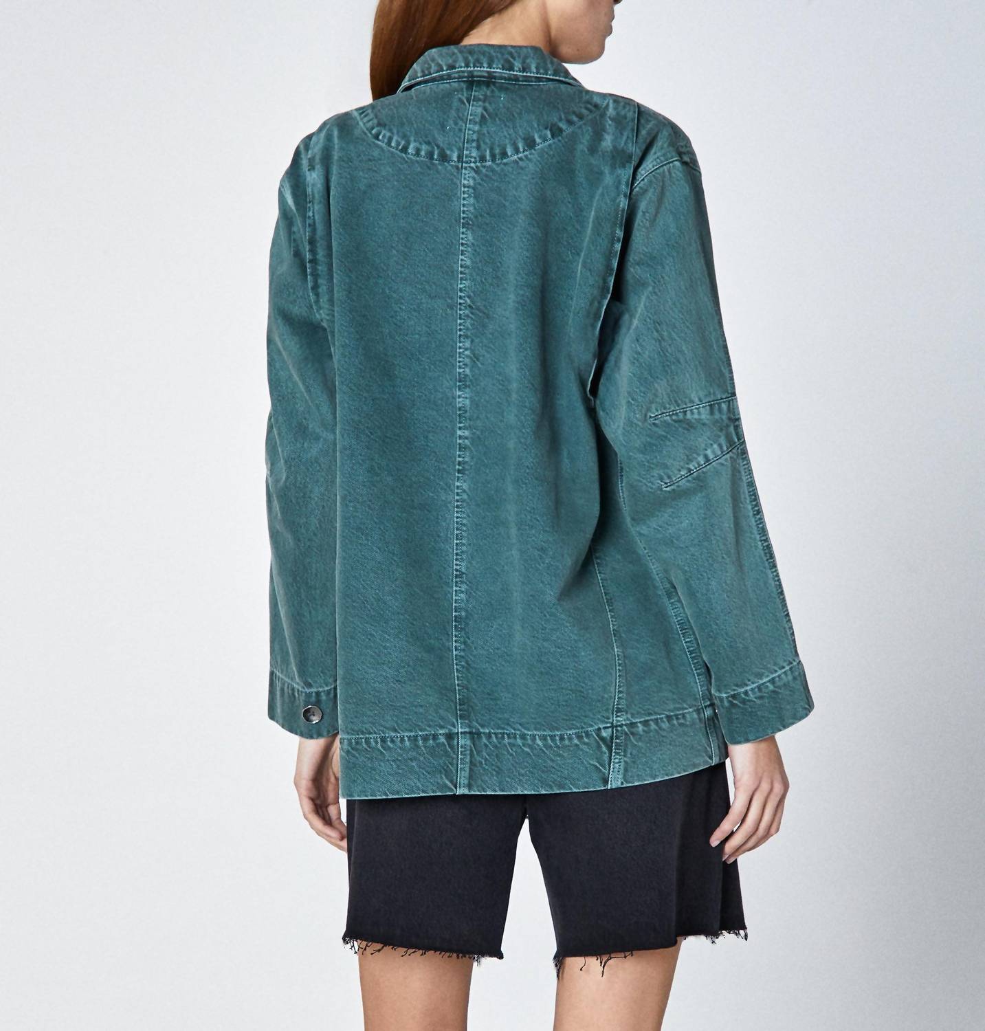 The ultimate cool-girl utility jacket. The Mari Chore Jacket by Unpublished is the quintessential utility piece in a refreshing Seawater color. With its long sleeves and oversized utility-style pockets, this solid-color jacket offers both style and practicality. Crafted from 100% cotton non-stretch denim weighing 11.6 oz., it features a button closure and a collared neckline. Dimensions: 42" chest, 29.75" length, 44.75" bottom opening; model is 5'10" and wears a size small. Care: Machine wash cold with like colors, do not bleach, tumble dry low, low iron if needed; hand wash and hang dry for best results recommended.