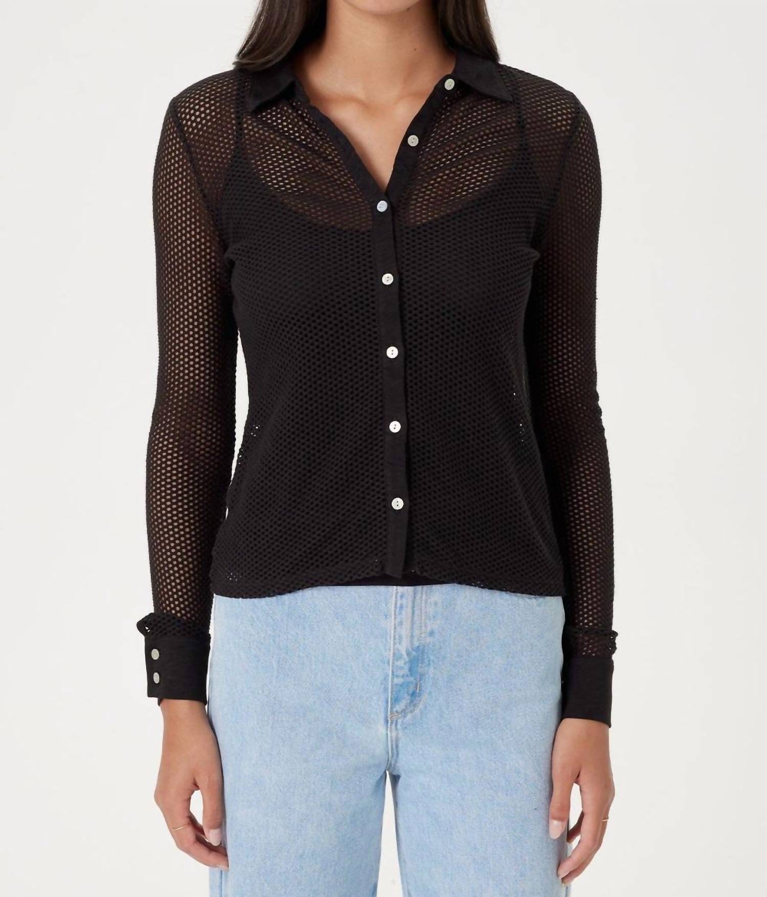 A classic button down shirt that will never go out of style. Play to win: in a luxurious fishnet shirt that shows some skin. Slub jersey trim adds structure and contrast to this daring style. 100% Peruvian pima cotton Luxe fishnet knit with signature slub jersey trim Made in Peru Body length: 23” Hand wash or machine wash on delicate