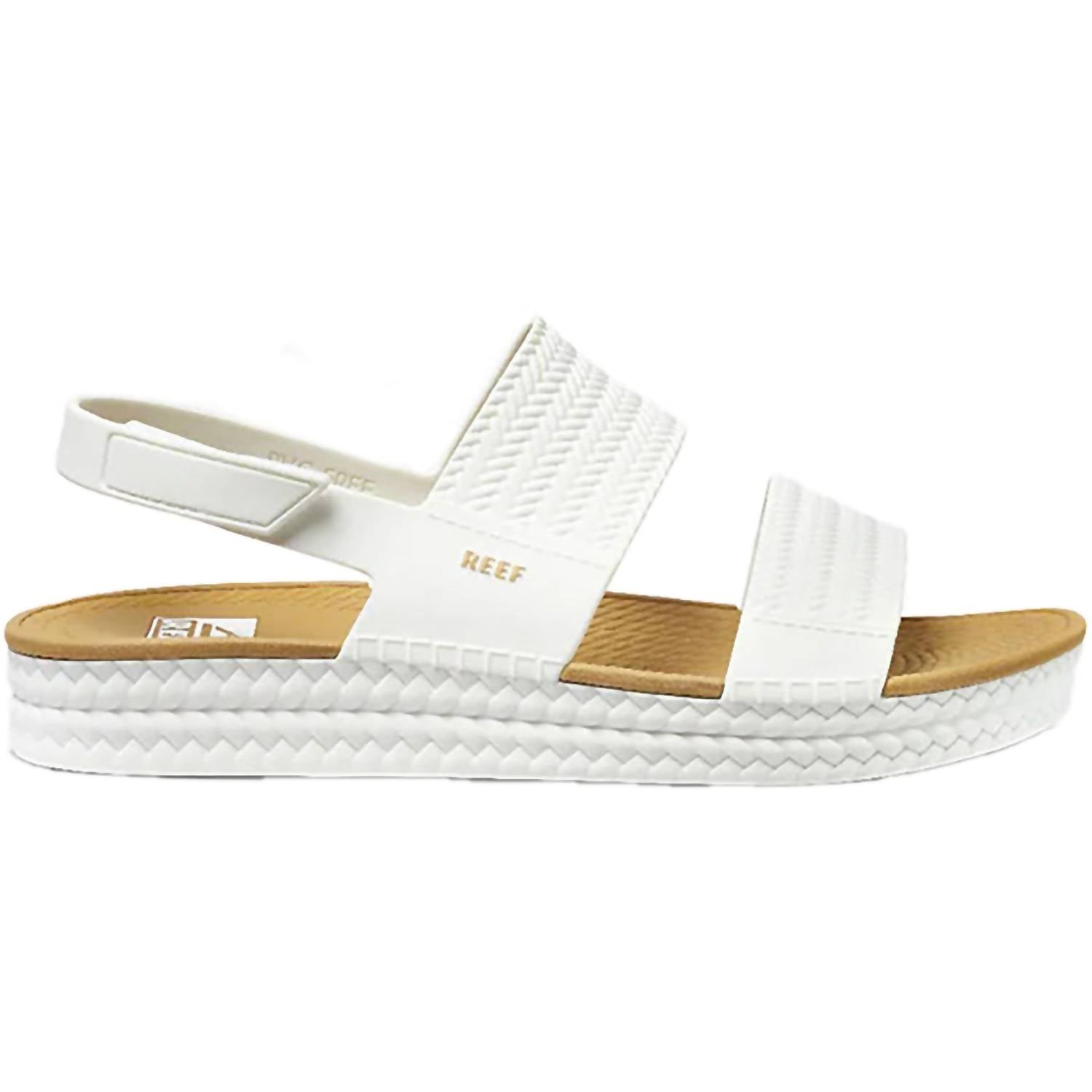 Classicly cute and all-day-wearable. We love this sandal. Meet the Women's Water Vista Sandals by REEF, a chic choice for your spring vacation wardrobe. Designed with water-friendly TPU straps in white and tan, these sandals boast an espadrille-inspired texture. The adjustable Velcro rear strap ensures a perfect fit, while the dual-density lightweight compression molded EVA footbed offers all-day comfort. Made to handle diverse terrains, their durable outsole makes them ideal for any adventure.