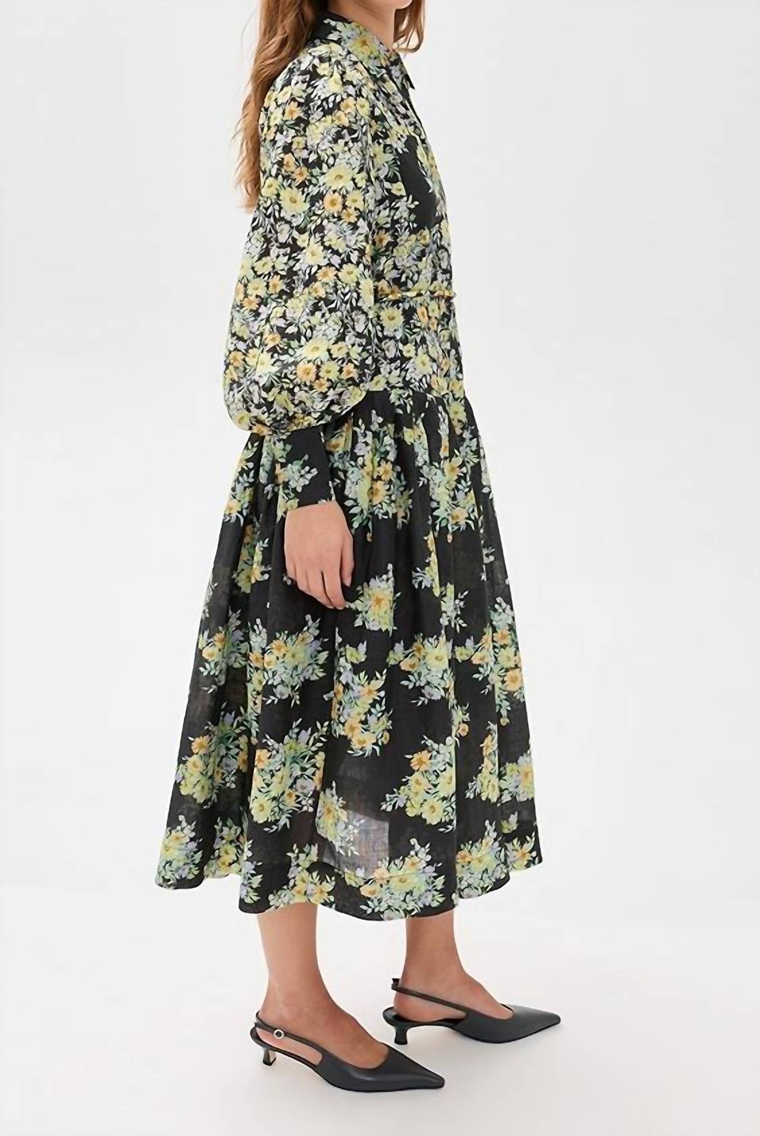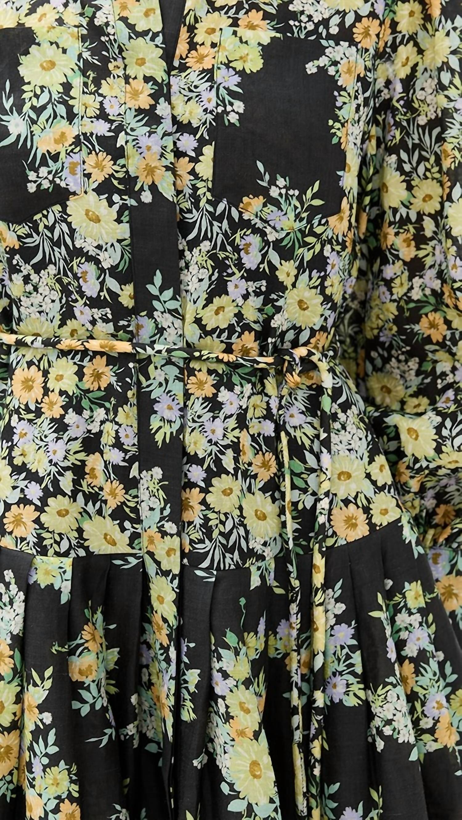 Just add slides or mules and you are good to go. Discover the Nina Midi Shirtdress by ALEMAIS, a sophisticated option for evening events. This stylish black shirtdress features long sleeves with tucks and cuffs, a pointed collar, and a concealed placket with self-covered buttons for a polished look. Crafted from 100% ramie, it includes a tiered skirt and a self-covered rouleau belt, complete with a slip. Closure: Button closure. Care: Dry clean only. Perfect for a vintage-inspired spring look, ideal for Thanksgiving gatherings.