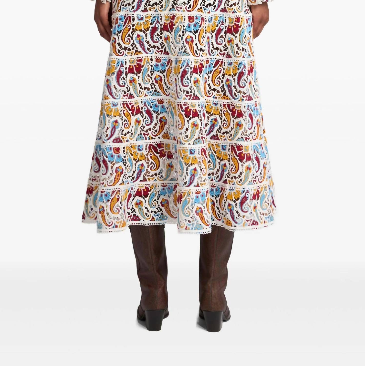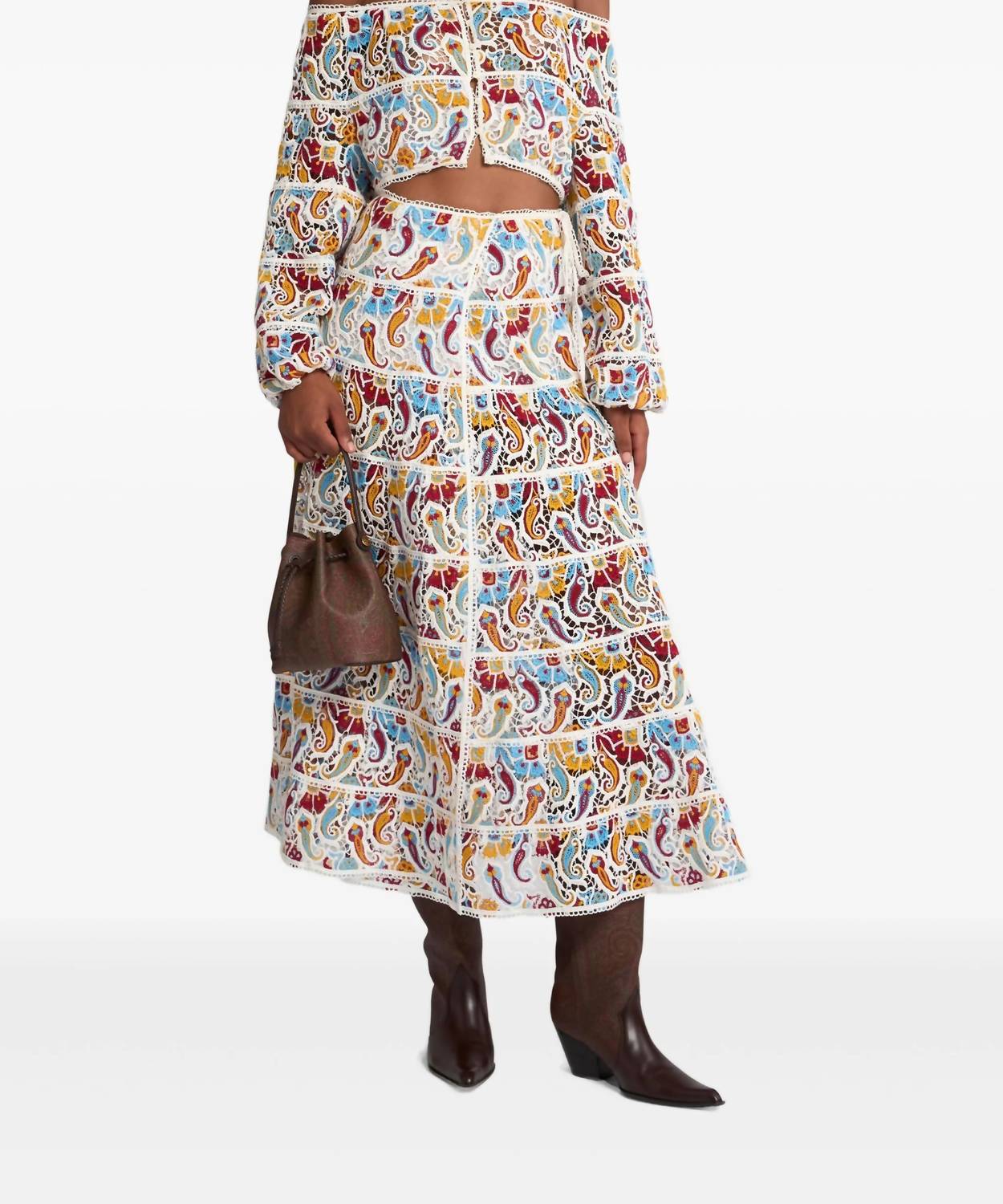 Tuck your favorite tee into this midi length skirt for an effortlessly cool look. Elevate your wardrobe with the Paisley Macrame Midi Skirt by ETRO, a stunning piece crafted for the Spring/Summer 2025 collection. This skirt features a chic wrap design with a straight hem in a vibrant multicolor paisley pattern. Made in Italy, it is composed of 80% Viscose and 20% Polyester with a 100% Polyester lining, and secures with a side tie fastening. Care for this boho chic essential by dry cleaning only.