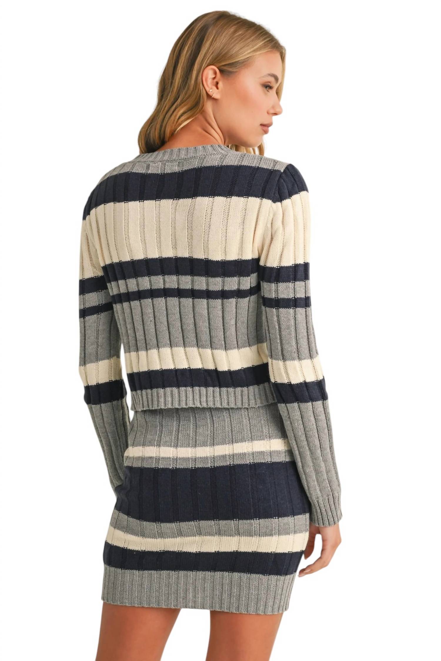 Elevate your wardrobe with the Sweater Knit Top and Skirt Set, a chic coordinated ensemble in a sophisticated stripe pattern. This women's set features a long sleeve top, crafted with 100% acrylic for a cozy feel. The crewneck design ensures comfort and style, while the pull-on closure makes it easy to wear. Ideal for layering or stand-alone statement pieces, this set is the epitome of modern elegance.