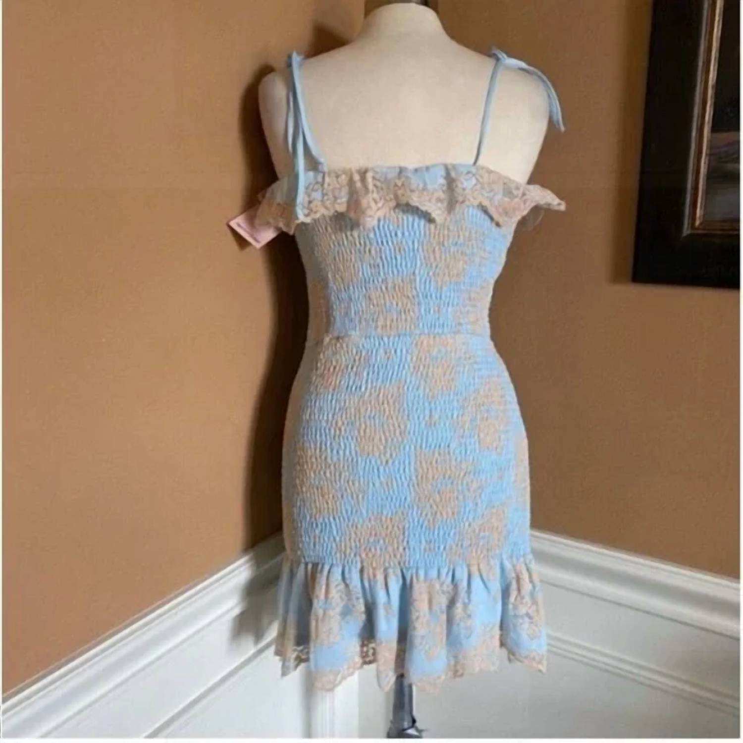 The perfect mini dress for those warmer months. The Storia Tie Shoulder Lace Hem Dress measures approximately 14 inches from pit to pit and 32.25 inches from shoulder to hem when flat. It features self-tie shoulders, a smocked body, and lace ruffle trim at the neckline and hem. Made of 65% nylon, 30% polyester, and 5% spandex, with a polyester lining. The dress is soft, stretchy, comfortable, and suitable for parties, beach outings, vacations, resort wear, homecoming, dances, girls' nights out, dinners, and date nights. It has a pullover style and a boho, romantic look.