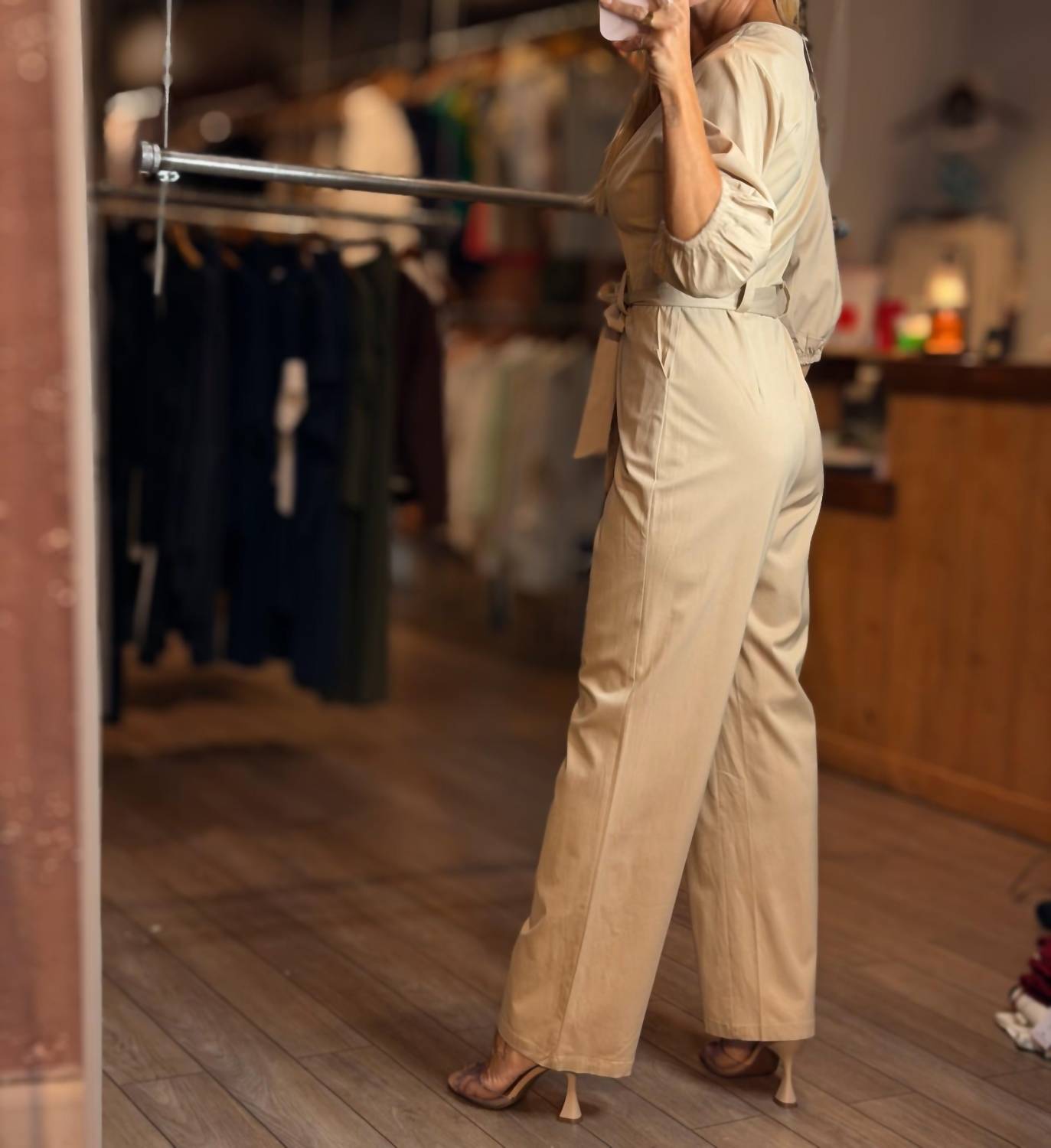 The perfect outfit choice when you you need something quick to throw on and still want to look efforlessly cool. Embrace timeless elegance with the Isadora 3/4 Sleeve Jumpsuit by Aurora, exclusively available at Aurora Boutique. This beige jumpsuit effortlessly combines sophistication with comfort, featuring a solid pattern and relaxed, high-rise fit. Its straight leg and button closure add a classic touch, while the pockets provide practicality. Proudly made in Brazil, the Isadora jumpsuit is perfect for fall occasions like Thanksgiving and dinner parties. Model is wearing size unknown (5’7” height, 36" bust, 28" waist, 36" hip).