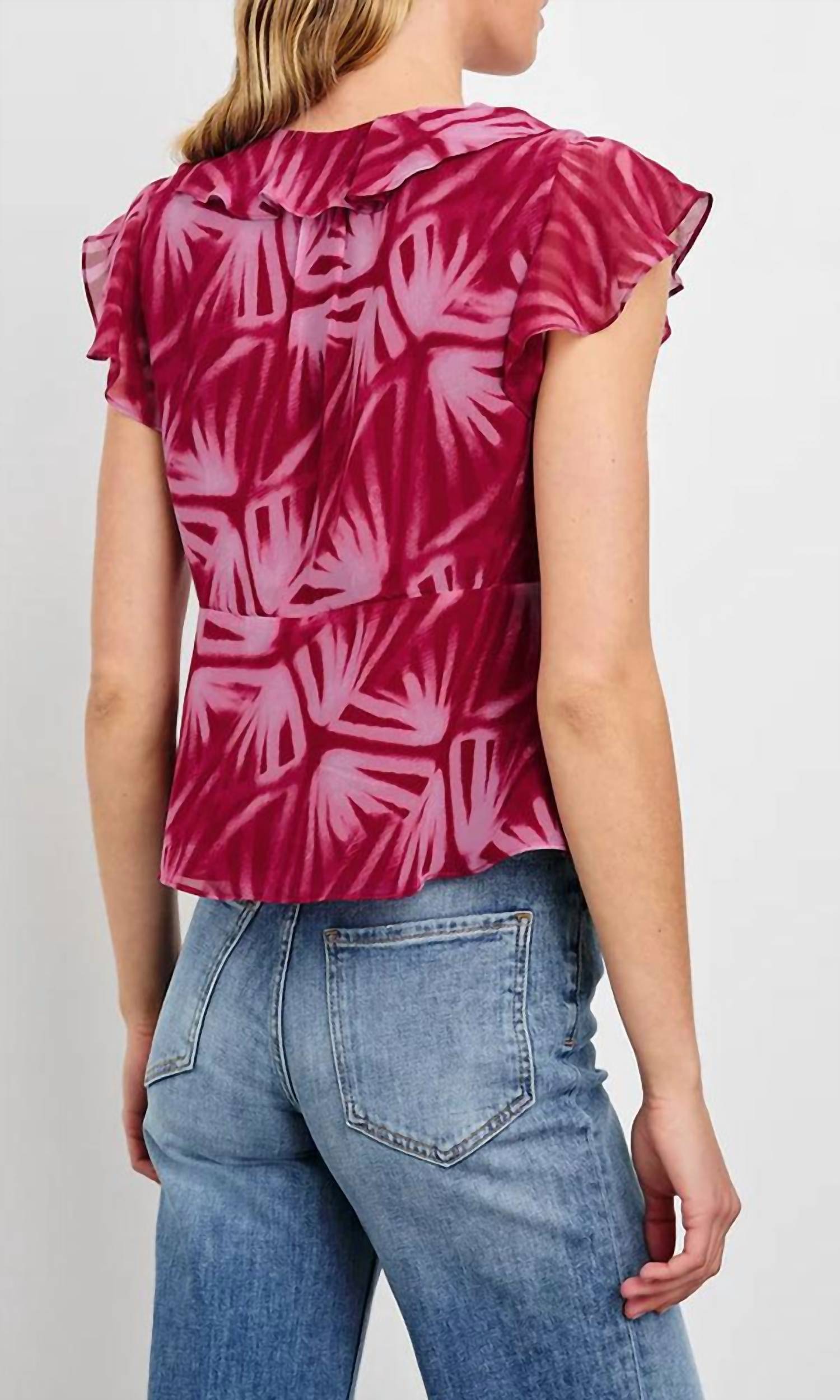 The short sleeve tee you'll want in every color. Introducing the Carmine Top by Rails, an ultra-feminine short-sleeve chiffon piece perfect for summer vacations. With its cap sleeves, this patterned top features a ruffled v-neckline and fluttering details that add elegance to its fluid fit. Crafted from 100% Viscose, it boasts an empire waist silhouette and a convenient pull-on closure. Imported and measuring 21 3/4" at the front body length (Size Small), it requires dry cleaning to maintain its stunning appearance.