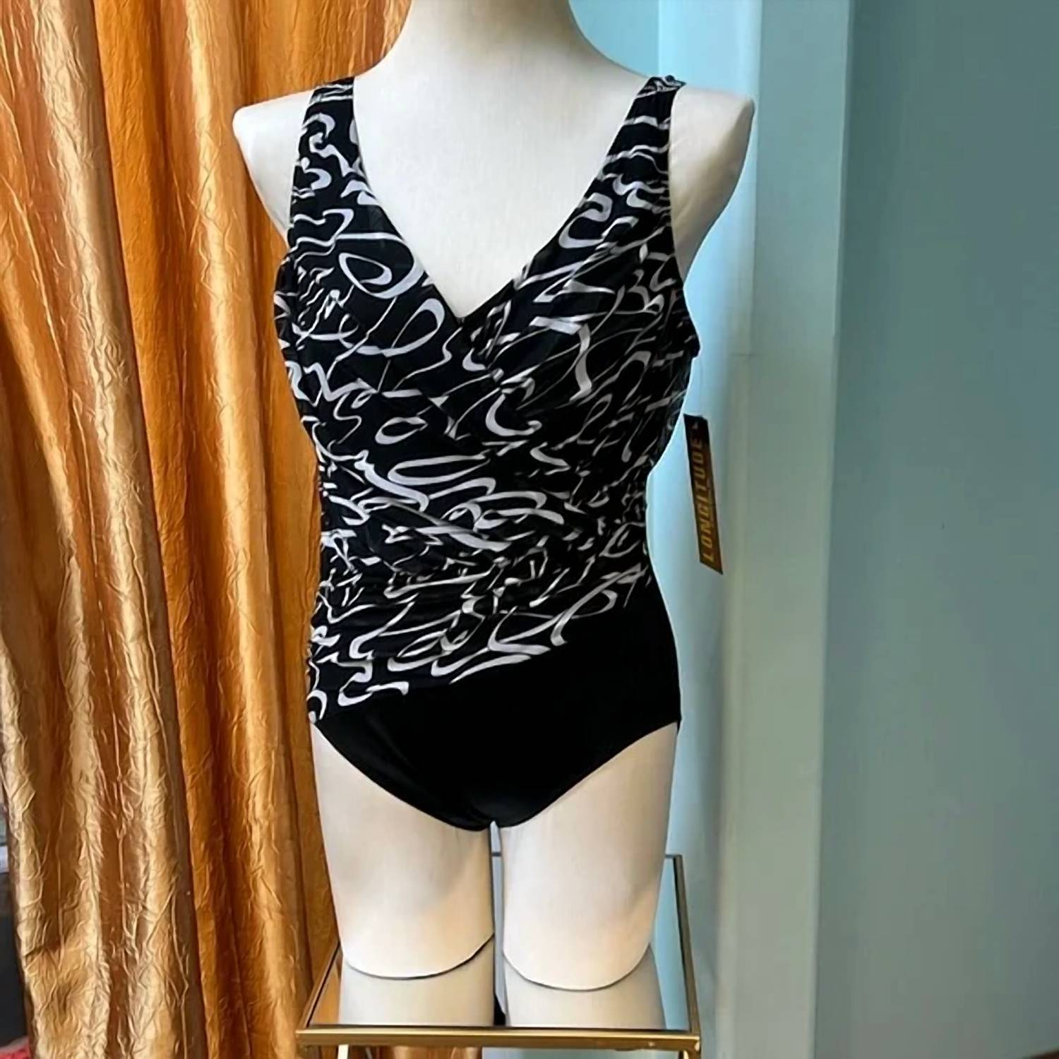 A one piece so chic you could even wear it as a bodysuit with your favorite pair of jeans. Introducing the Longitude Women's Ruched One Piece Swimsuit in a chic black and white abstract print, perfect for your next beach day. This stylish swimsuit offers a flattering hourglass shape with tummy control, complete with a soft cup bra and fixed straps for comfortable support. Featuring full coverage with a scoop back and modestly cut legs, it provides confidence for all body types. Care instructions: Hand wash only.
