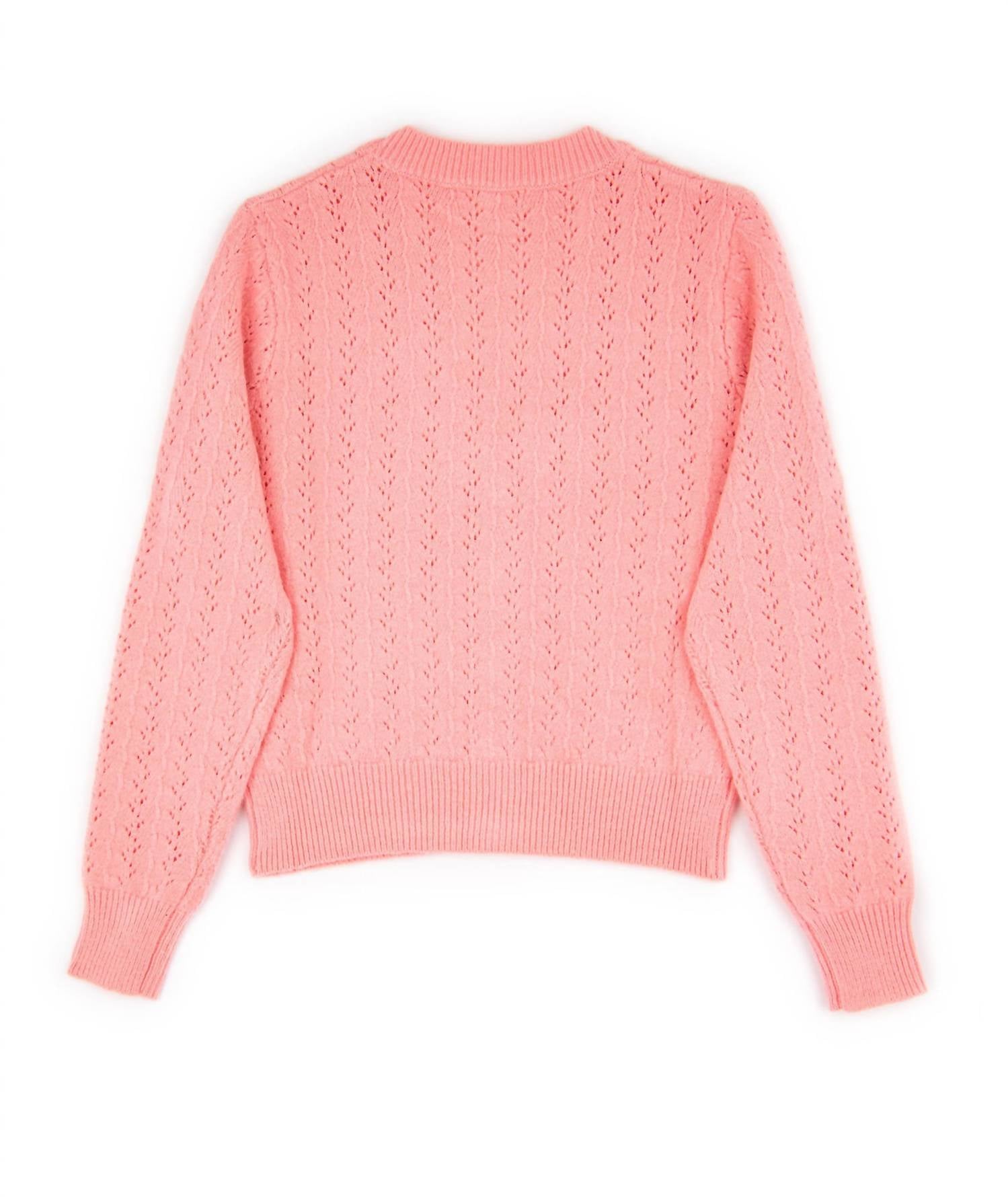Buttery soft cardigan. Five button closures. Slightly pleated shoulder detailing. Knit crochet detailing. Viscose, Polyester, Nylon Blend. Machine wash, flat dry. Model is wearing a Juniors/Women S.