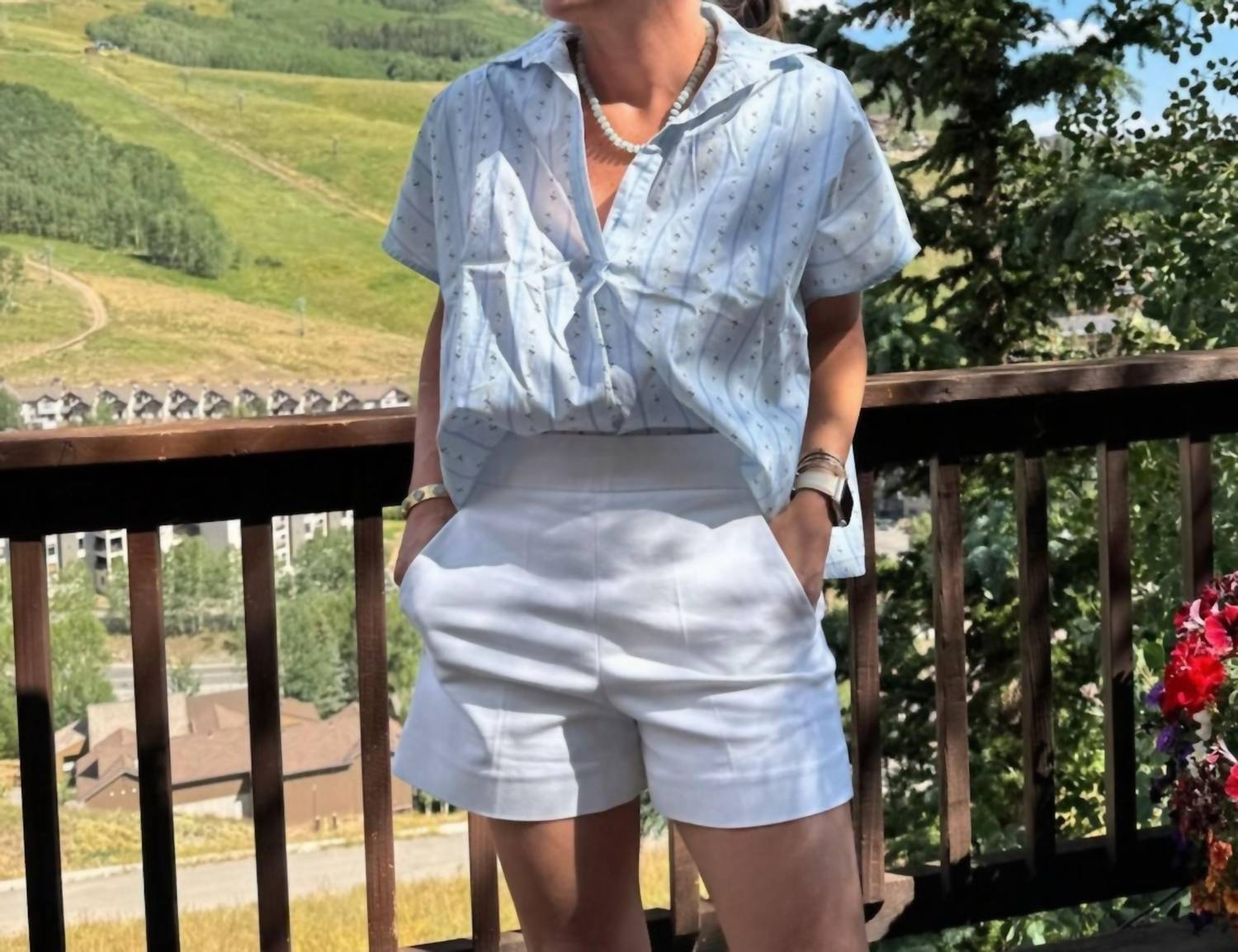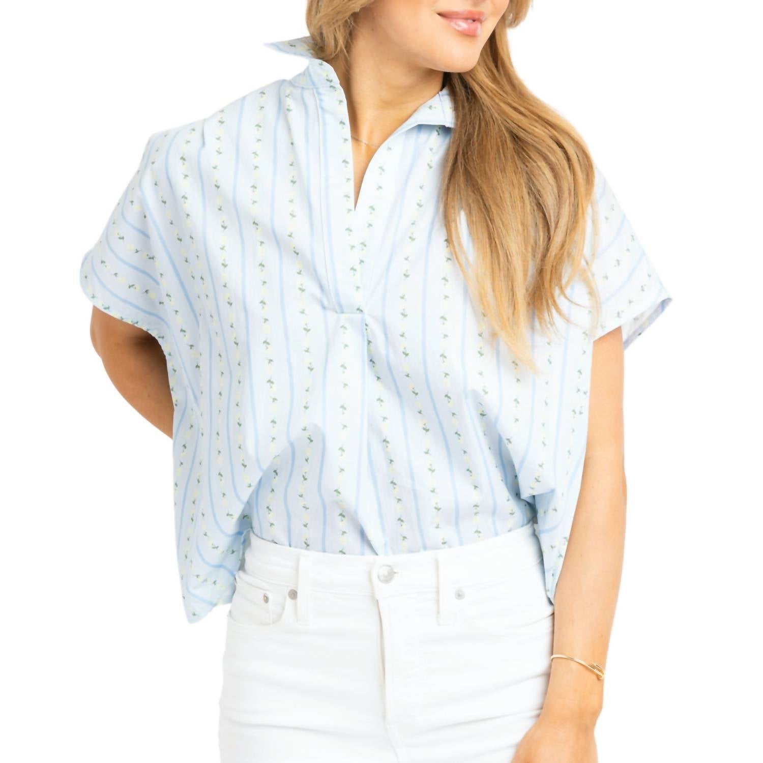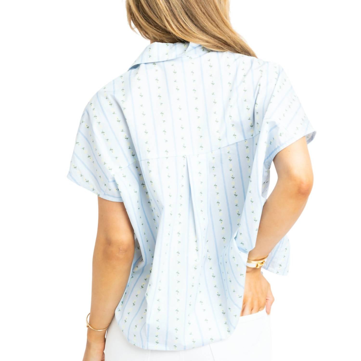 A versatile blouse that works from desk to dinner! Elevate your wardrobe with the Floral Stripe V Neck Collar Top by Karlie, showcasing a chic short-sleeve design in timeless blue. This blouse, highlighted by a floral pattern, features a relaxed, boxy silhouette and a classic collared neckline, complemented by a button closure. Ideal for varied occasions, its dropped shoulders impart a modern twist. Care: Machine wash to maintain its fresh look.