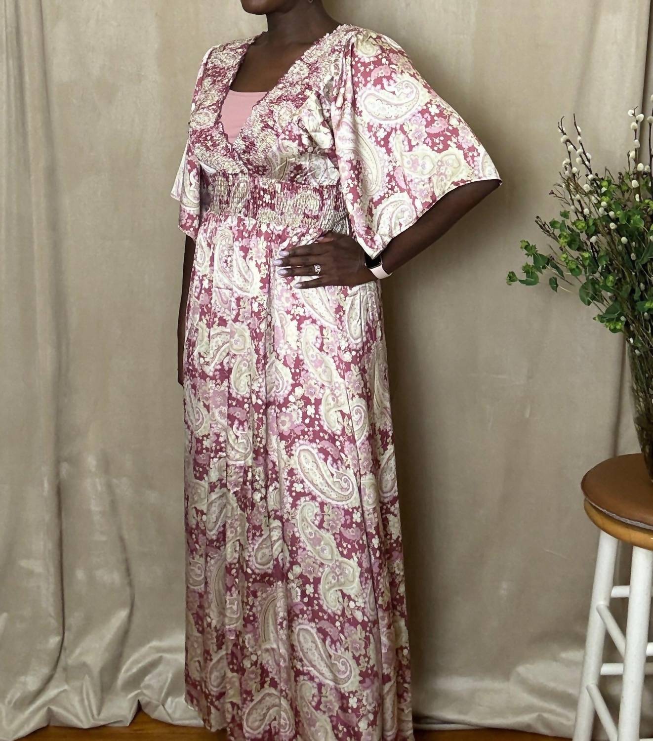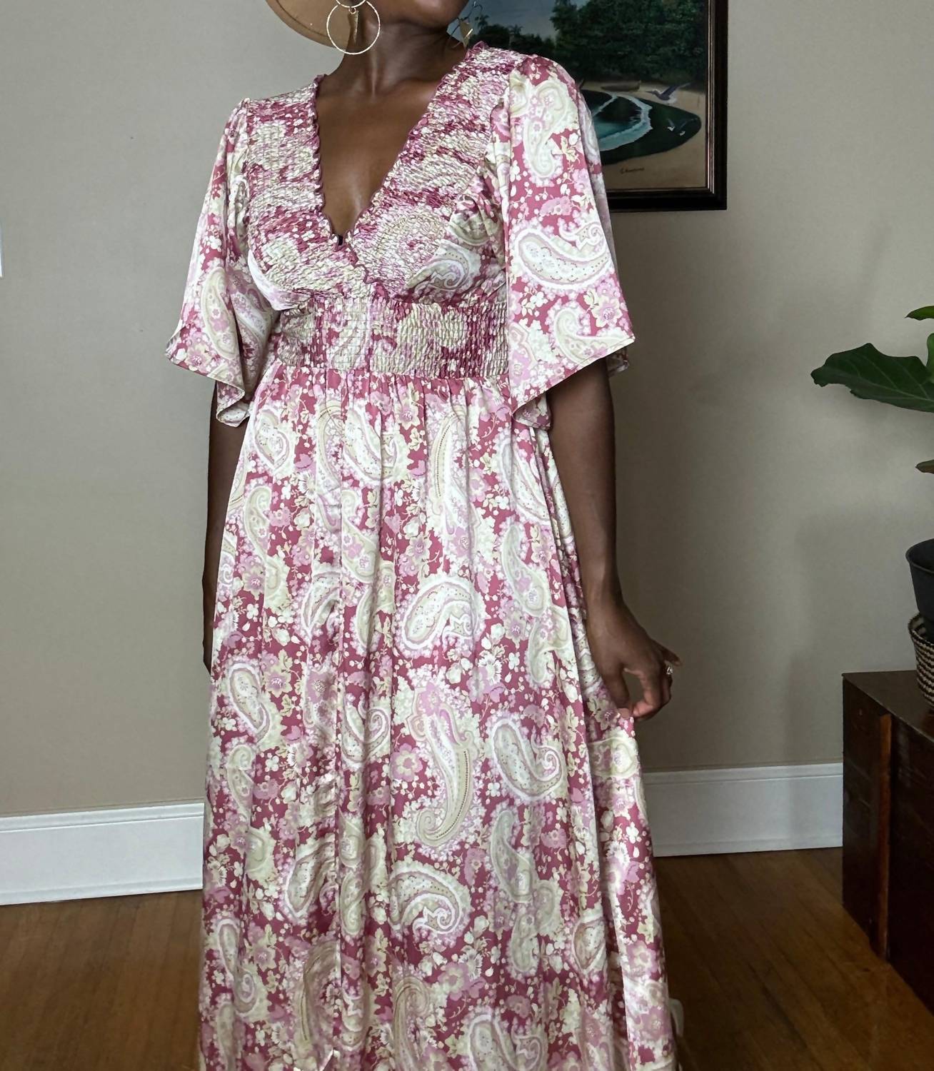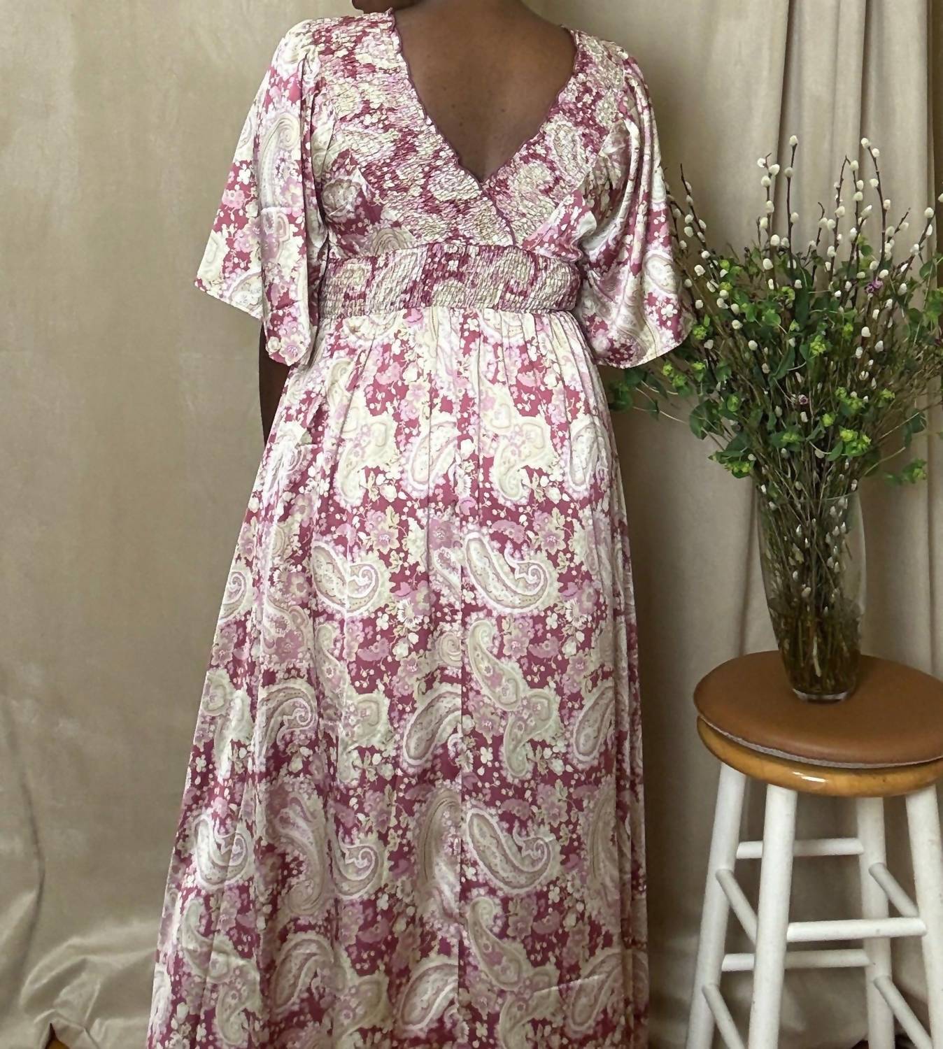 Style this maxi with your favorite statement necklace and sandals for the perfect look. Discover the Belah Paisley Print Maxi Dress by mittoshop, the idyllic choice for summer weddings and sophisticated gatherings. This fit and flare silhouette showcases short ruffle sleeves and a flattering V-neckline, gracefully crafted from 100% polyester in a luxurious satin finish. The elegant maxi dress features a distinctive paisley print with intricate smocking detail on the front and back, complete with a partially lined skirt for added comfort. Closure: Pull-on style. Care: Machine wash. Model details: 1st model is 5'9" wearing a medium, 2nd model is 5'9" wearing a small.
