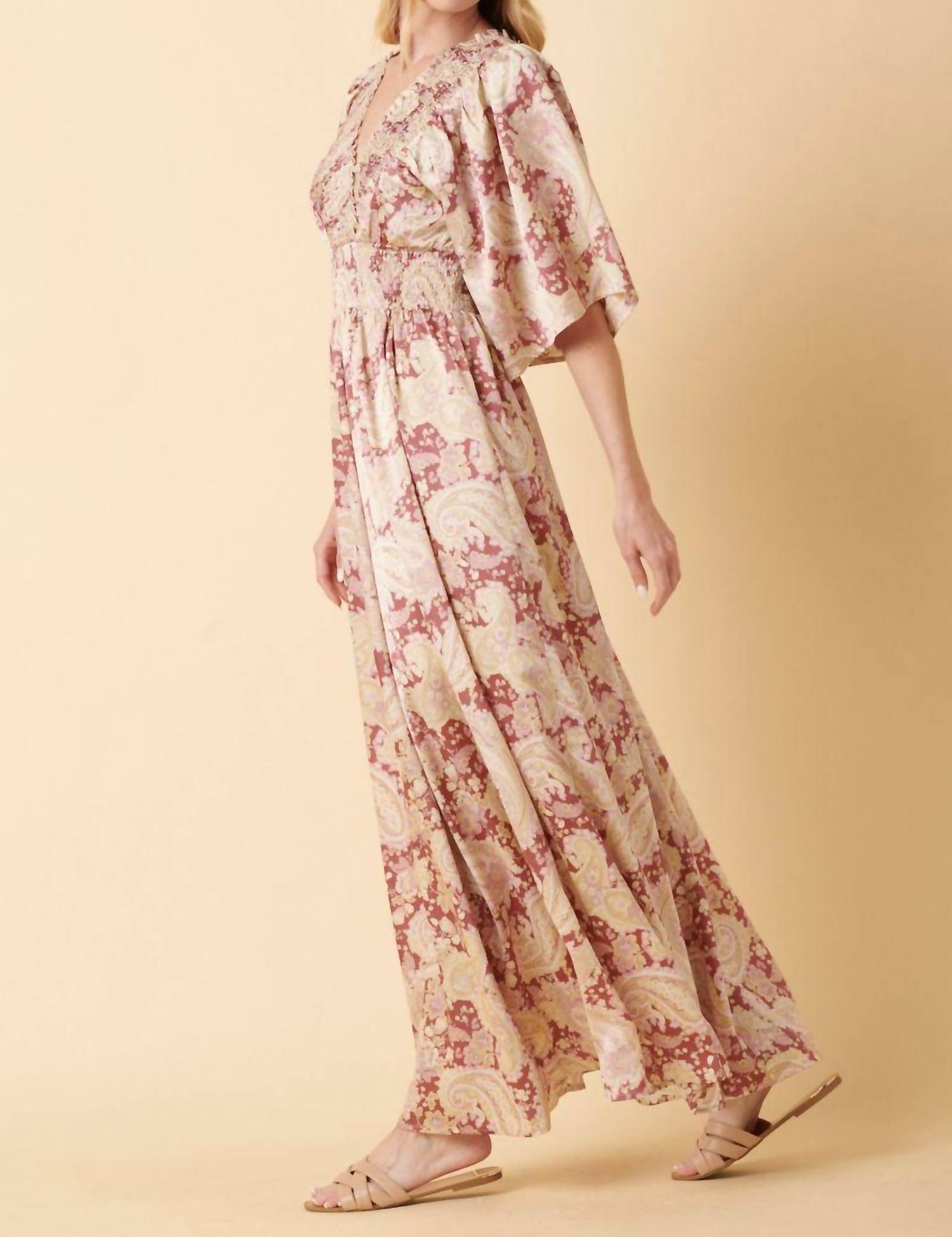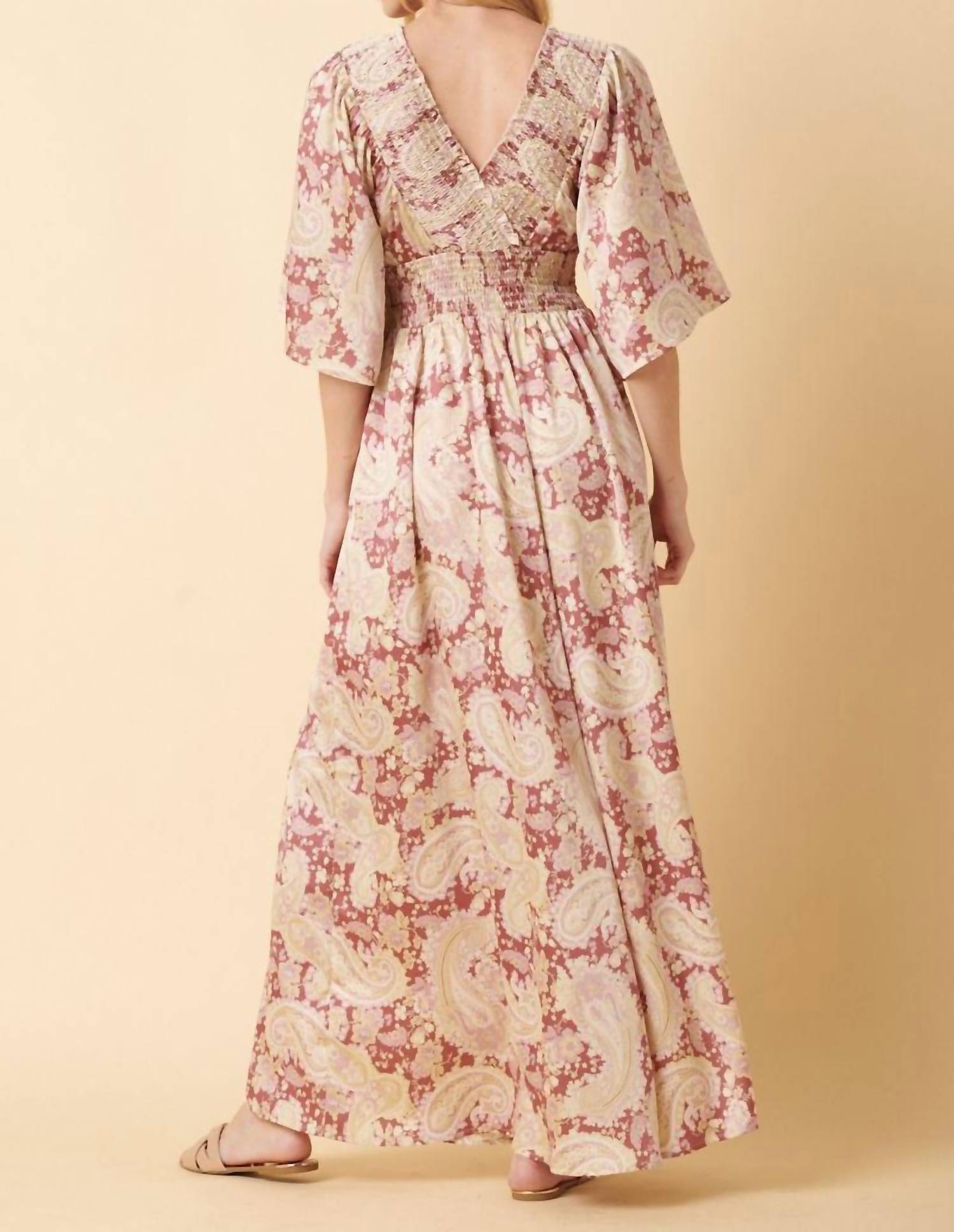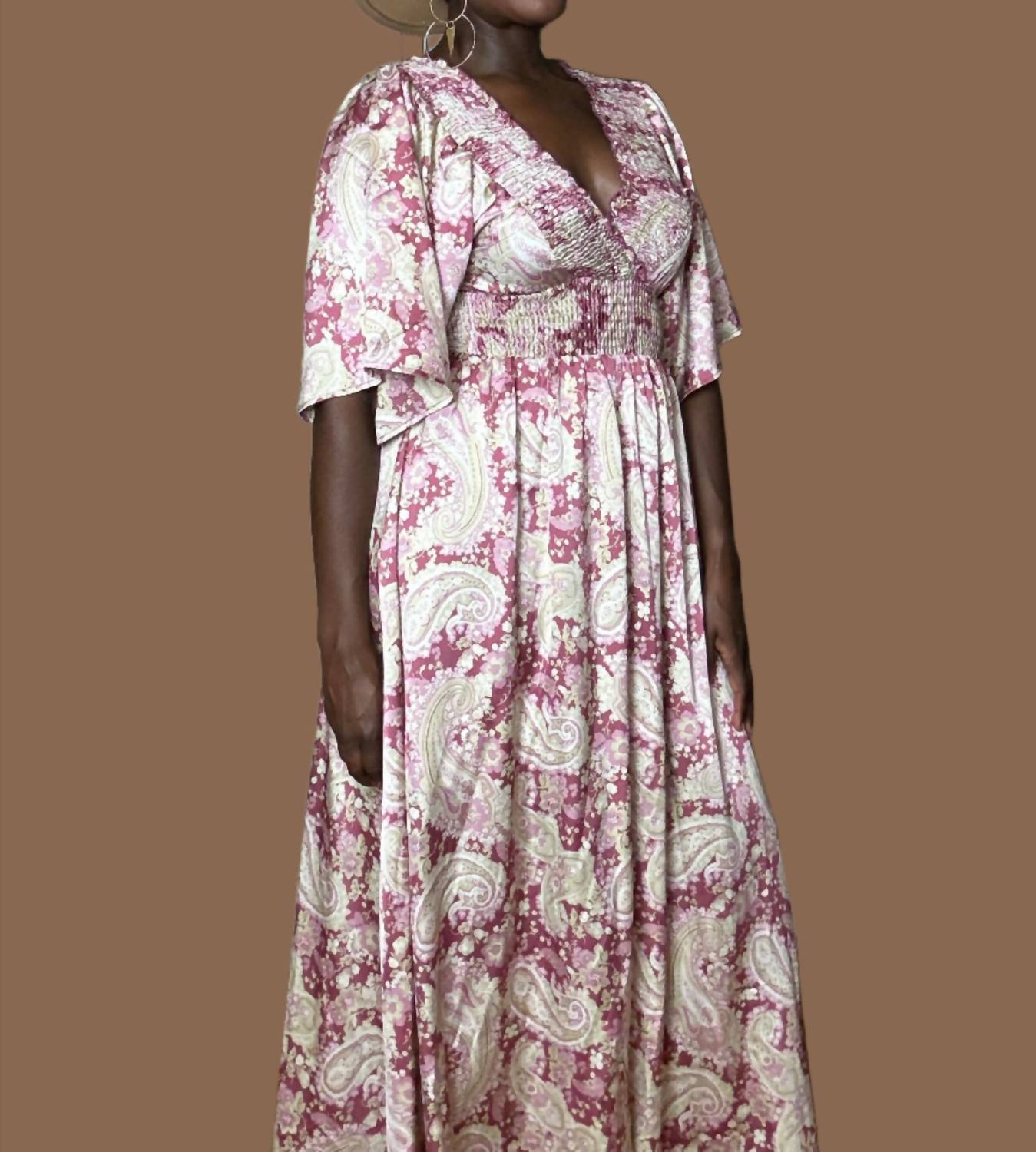 Style this maxi with your favorite statement necklace and sandals for the perfect look. Discover the Belah Paisley Print Maxi Dress by mittoshop, the idyllic choice for summer weddings and sophisticated gatherings. This fit and flare silhouette showcases short ruffle sleeves and a flattering V-neckline, gracefully crafted from 100% polyester in a luxurious satin finish. The elegant maxi dress features a distinctive paisley print with intricate smocking detail on the front and back, complete with a partially lined skirt for added comfort. Closure: Pull-on style. Care: Machine wash. Model details: 1st model is 5'9" wearing a medium, 2nd model is 5'9" wearing a small.