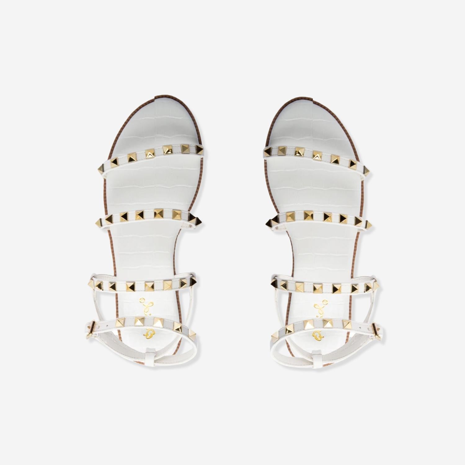 This sandal will take you from brunch to dinner and everything in between. Embrace a chic summer vibe with the Women's Studded Strappy Sandals by Qupid, designed for the modern woman. Crafted from soft faux leather, these white sandals boast an edgy studded detail and an open toe shape. Perfect for warm-weather attire, their flat heel and durable rubber sole ensure lasting comfort. Slip-on design makes them the ideal choice for hassle-free style, pairing effortlessly with shorts, sundresses, or jeans.