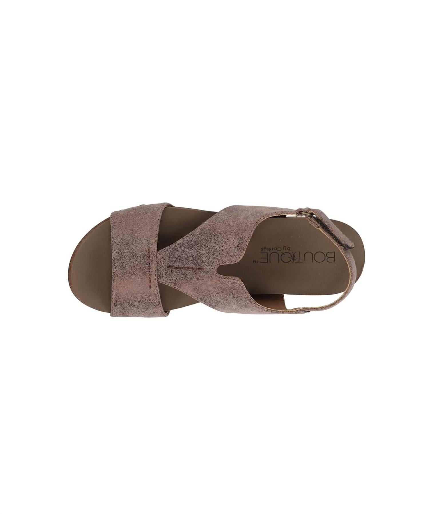 Open toe. Cushioned sole. Adjustable velcro back strap. Faux leather with shimmer detial. Sole material: Faux cork. Buckle closure. Made in USA and Imported.