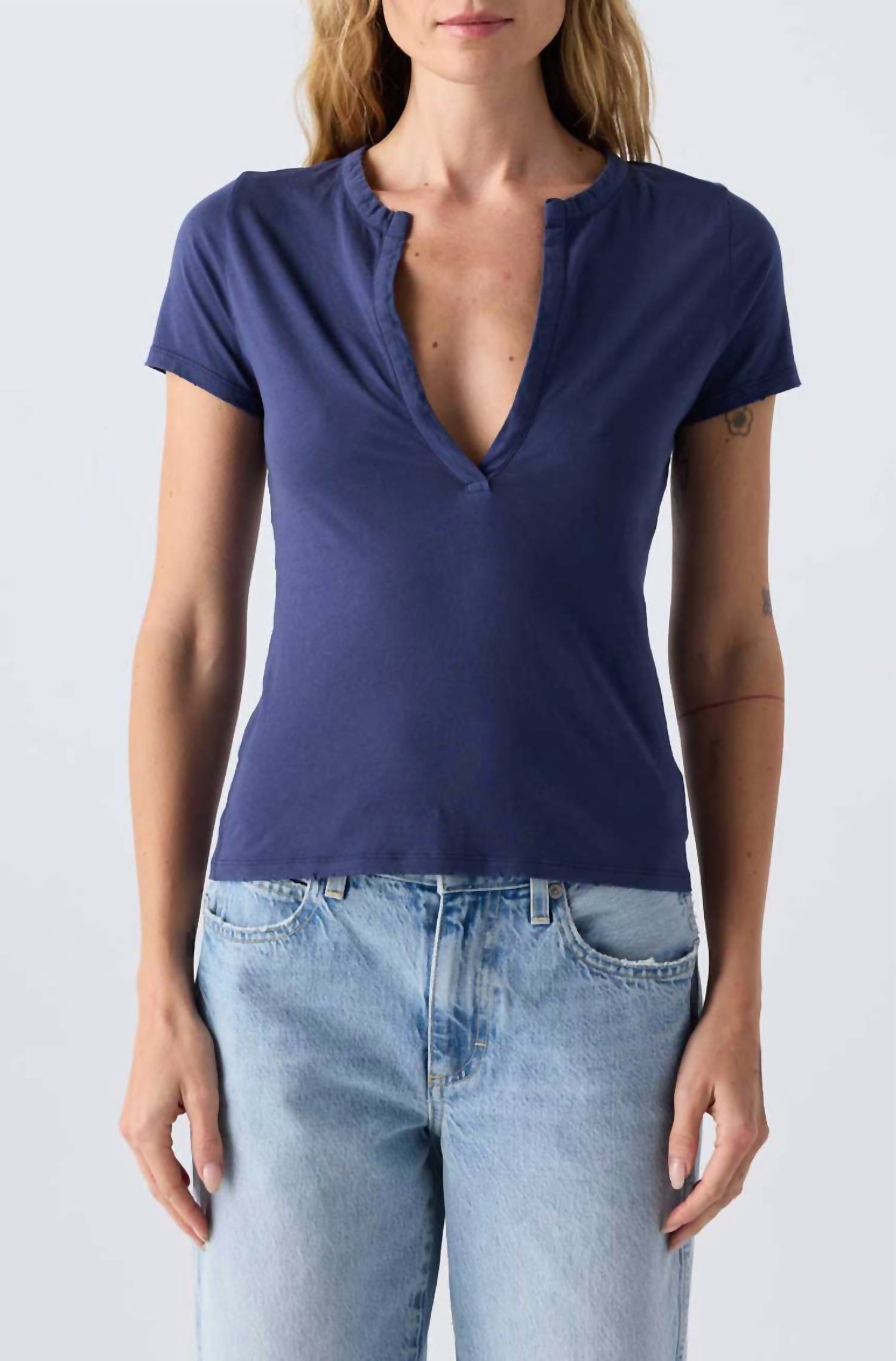 Look no further, you just found your perfect tee! The Women's Delightful Tee by AMO in Neptune is your go-to choice for a chic summer look. This short-sleeve tee, made from 100% cotton, offers a stylish fit with a deep notched V-neckline. Crafted in Portugal, it measures 23" in length and 34" across the chest, fitting true to size. For effortless care, simply machine wash it cold.