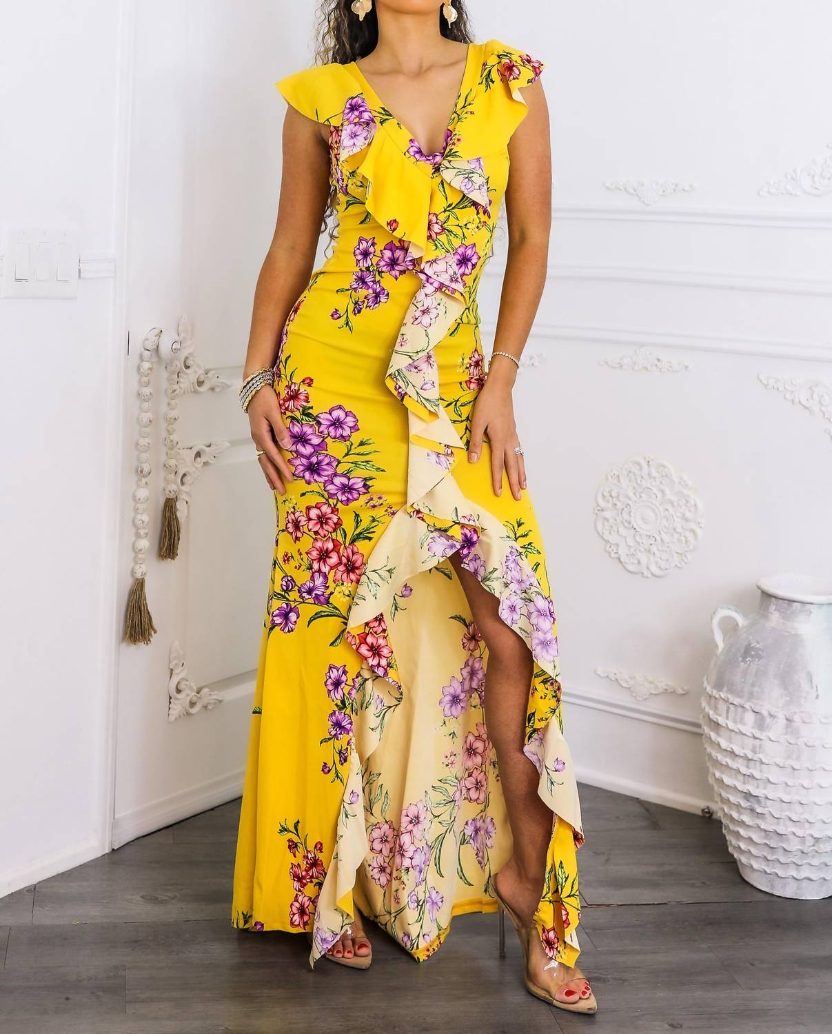 Who doesn't love a good maxi dress? This one you'll be reaching for season after season. Introducing the Sunshine Bloom Ruffle Maxi Dress by SurelyMine, a radiant must-have for your summer wardrobe. Crafted in a vibrant yellow stretchy fabric, this sleeveless wrap dress features a flirty front slit and cascading ruffles, embodying the boho chic trend. Its floral print and figure-hugging silhouette create a feminine vibe, perfect for vacations and warm-weather occasions. The design ensures comfort and style, allowing you to make an unforgettable entrance.