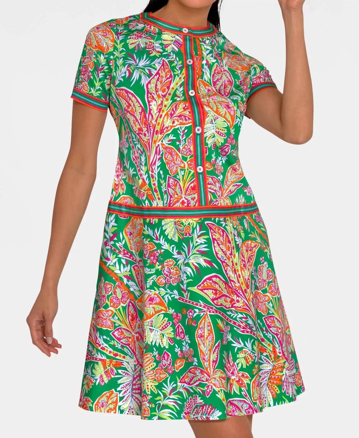 A midi dress so versatile, your options for wearing it are endless. Introducing the Mademoiselle Short Sleeve Dress by Gretchen Scott, a chic midi dress capturing a vintage vines floral pattern. Crafted with a 97% cotton and 3% spandex blend, it assures breathable comfort and a flattering A-line silhouette. The dress features a crewneck with banding on the neckline, sleeve edges, hips, and front placket, while shell buttons provide a sophisticated button closure. Measuring a total length of 36", it's designed for easy maintenance with machine wash cold and cool tumble dry or dry clean options.