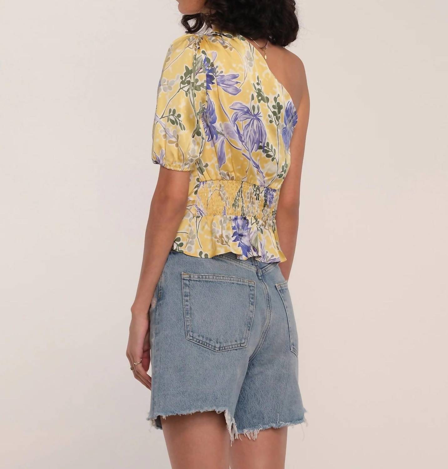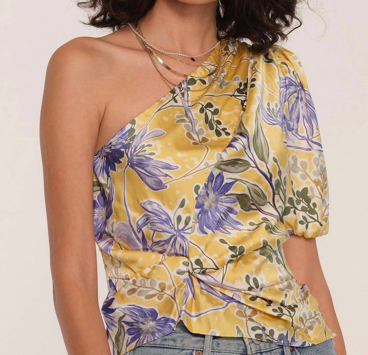 Printed Satin. Twist Front Detail. Asymmetric Puff Sleeve.100% Polyester. Hand Wash Cold
