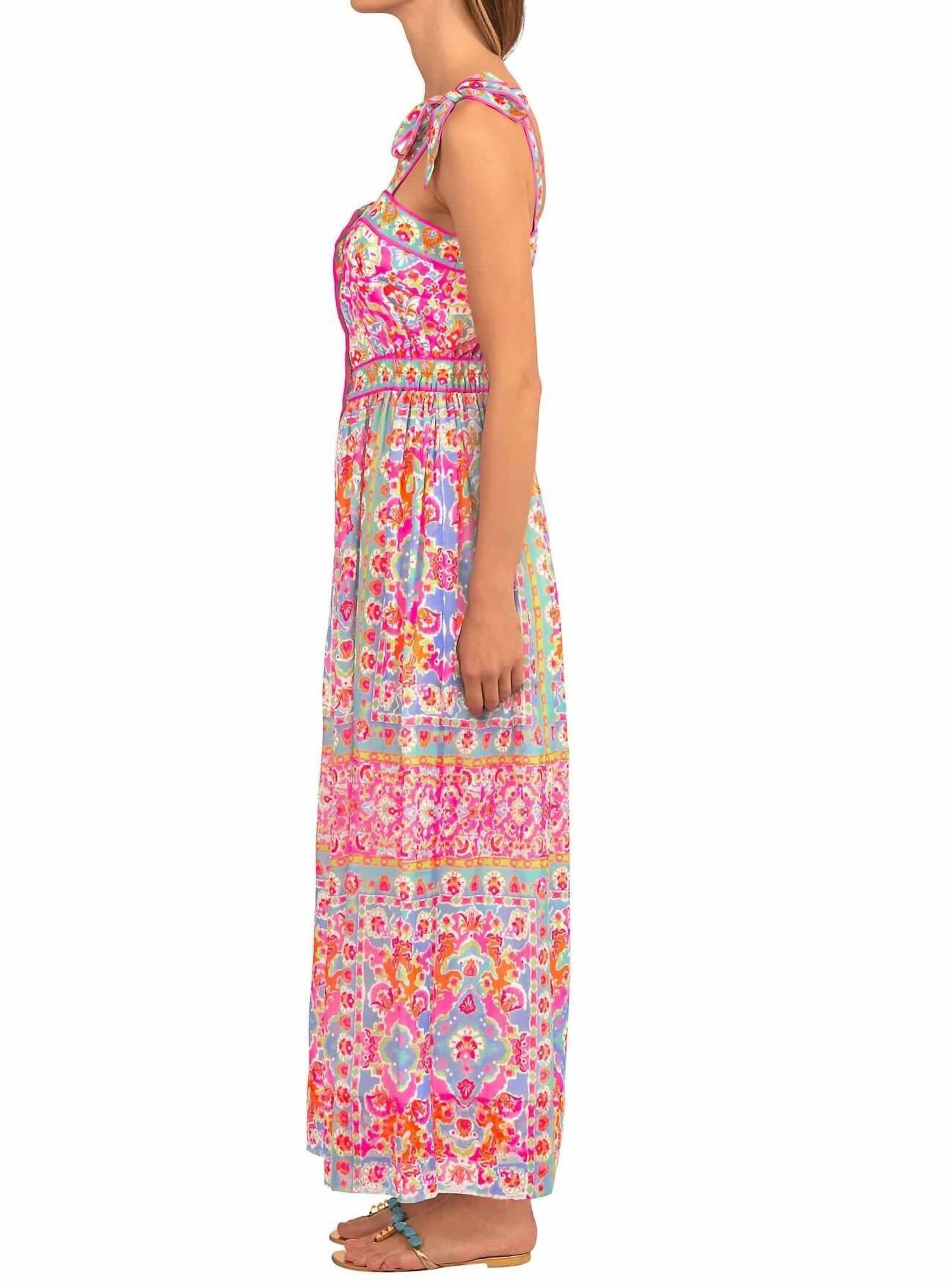 This dress features coordinating fabric on the placket, empire waist, skirt, self-tie shoulder straps, and inside back panel. It has a 4-inch hand hem, shell buttons, and elasticized side waist inserts for a comfortable fit. The dress also includes side seam pockets. Made from 100% polyester, it is machine washable in cold water and has a length of 50 inches.