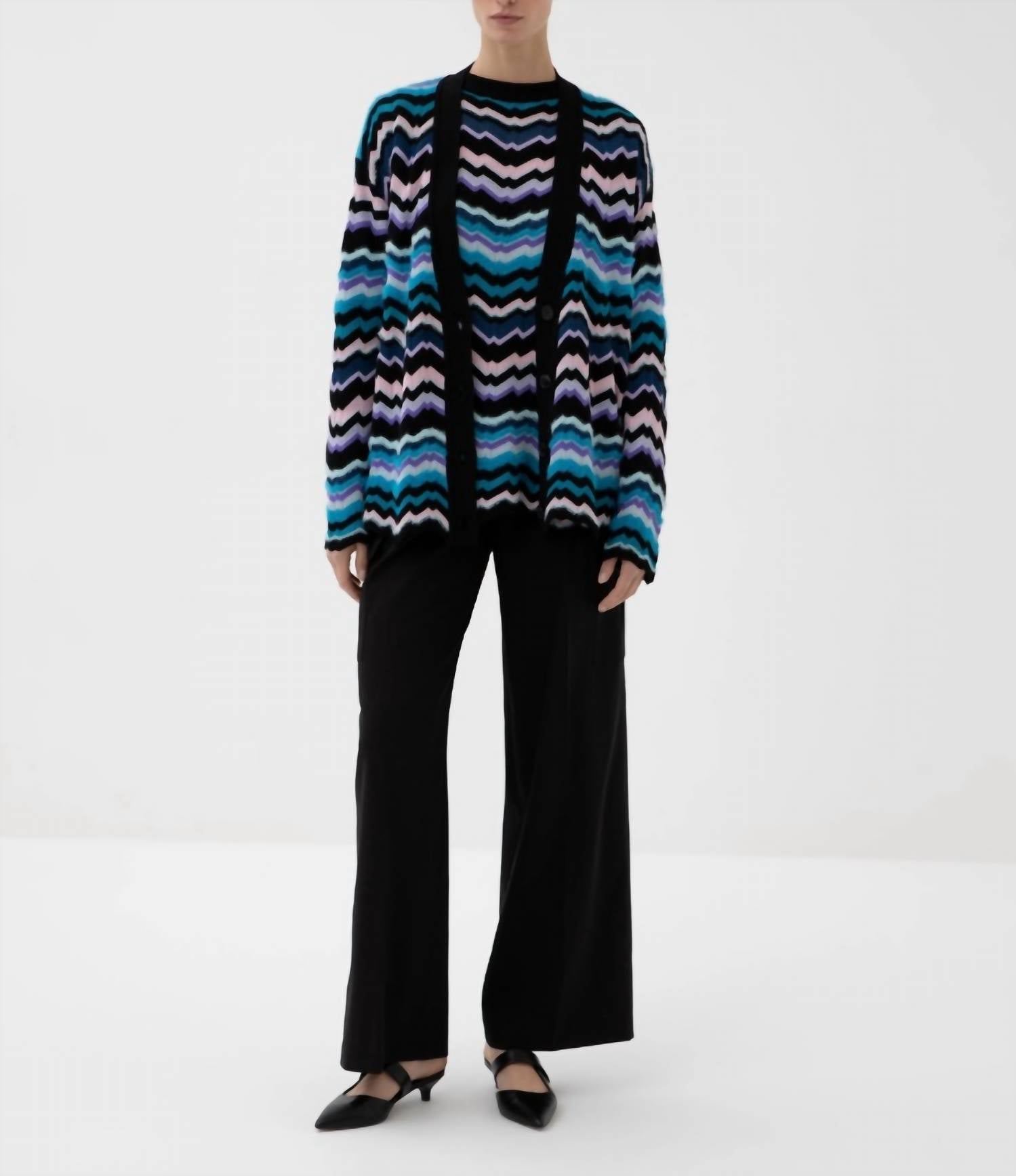 A classic fit that works just as good buttoned as it does left open. Introducing the Textured Cardigan by Missoni, a vibrant addition to your fall wardrobe in a striking multicolor on a blue base. This long sleeve cardigan is crafted in Italy from a blend of 55% viscose, 40% wool, and 5% polyamide, ensuring a soft feel and reduced static. It features a deep V-neck and button closure for elegant styling. Care for this piece with dry cleaning to maintain its luxurious texture.