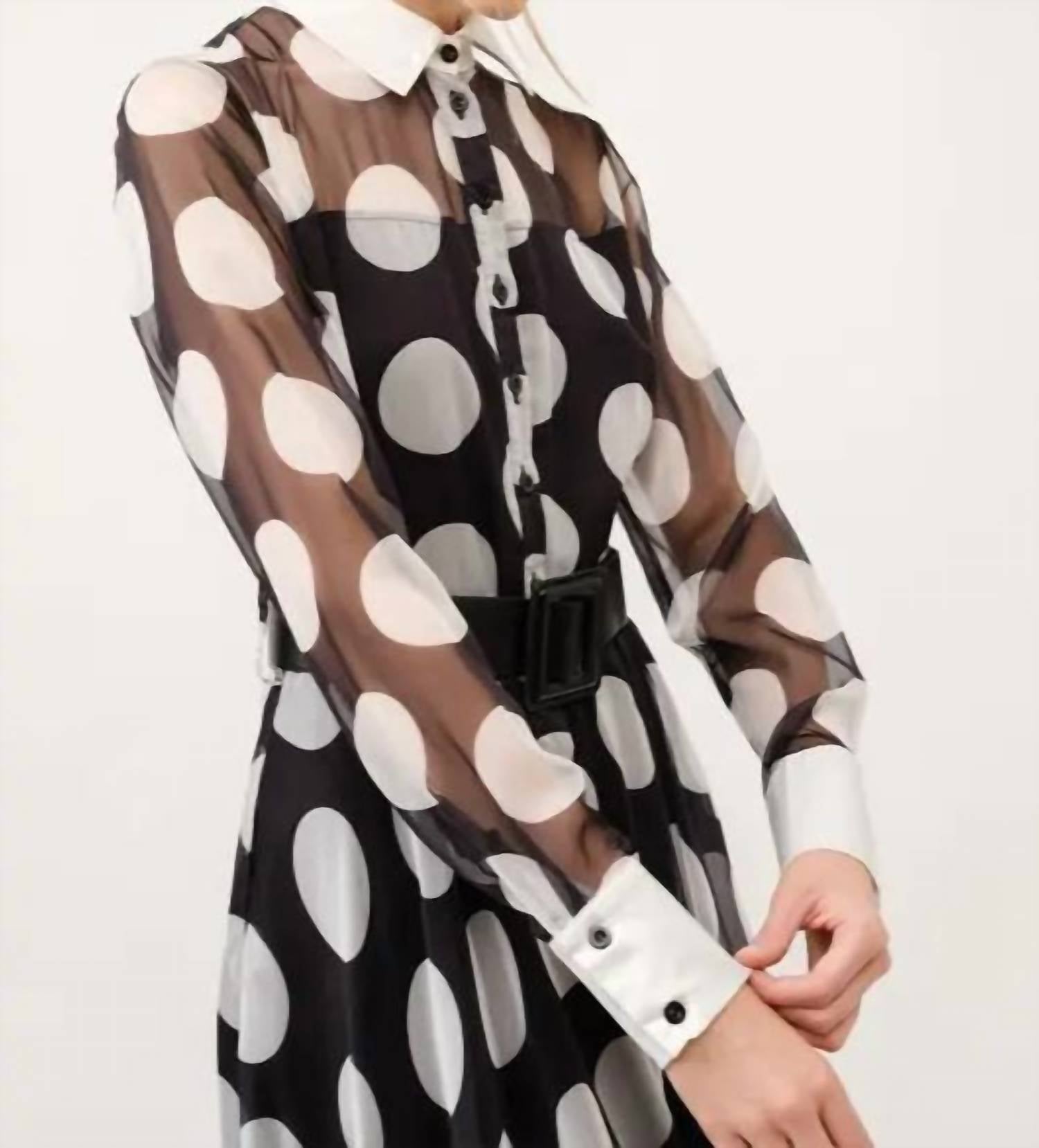 A maxi dress that is just as cute as it is comfortable. The INA Polka Dot Print Long-Sleeve Maxi Dress adds a playful touch to your wardrobe with its chic black A-line silhouette and charming polka dot pattern. Crafted from 100% polyester with a contrasting blend of 96% polyester and 4% spandex, and fully lined with polyester, this dress assures comfort and style for any occasion. Featuring a graceful crewneck and a convenient button closure, this dress is ideal for spring anniversary celebrations. Care instructions recommend hand washing to maintain its maximalist appeal.