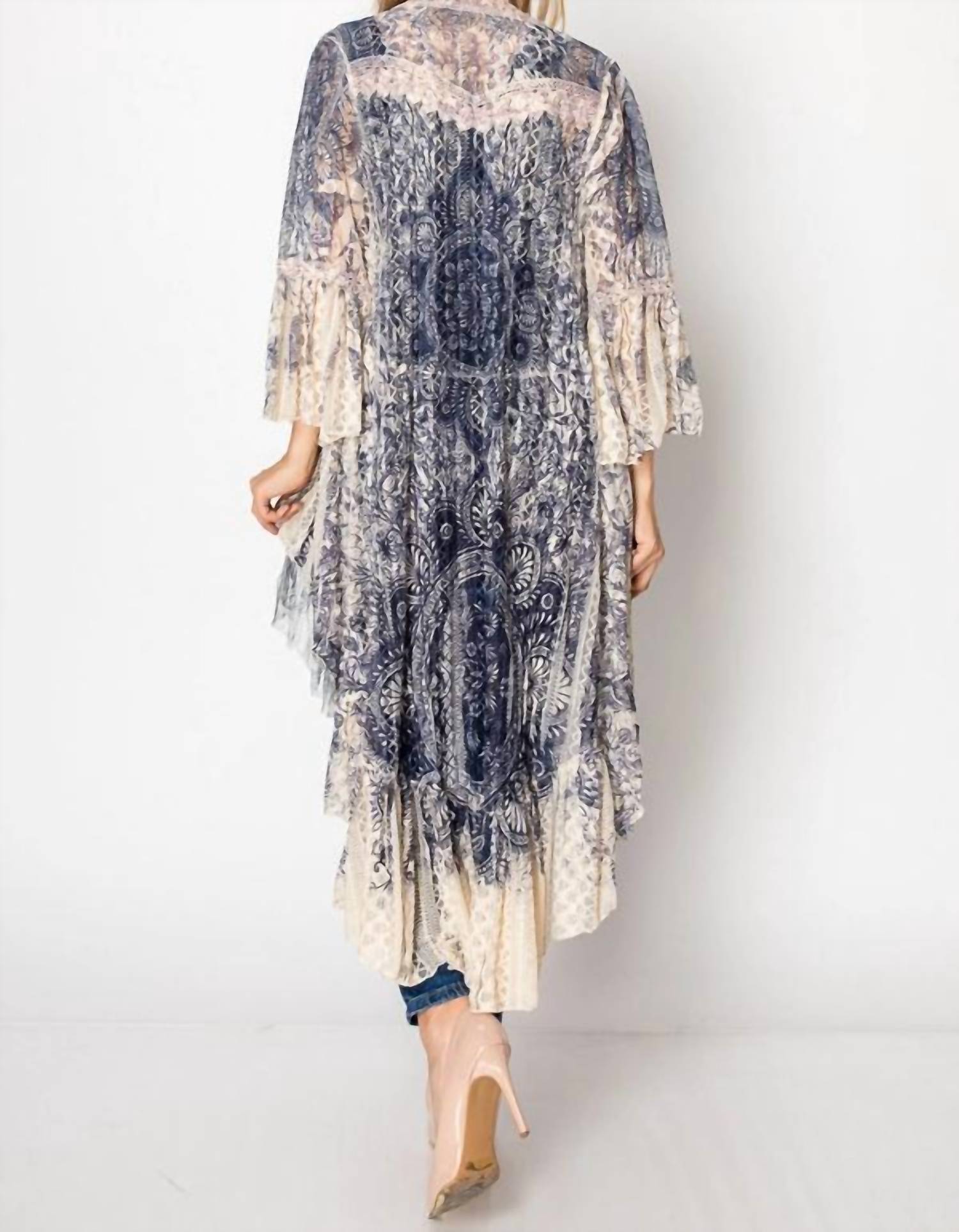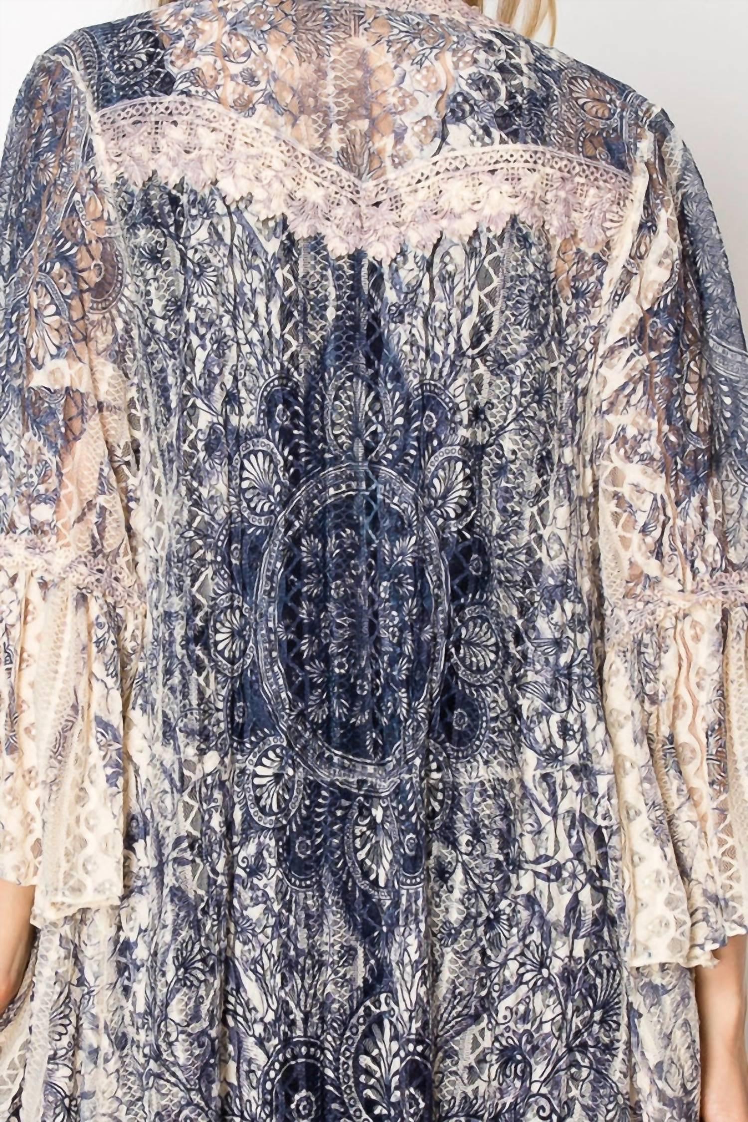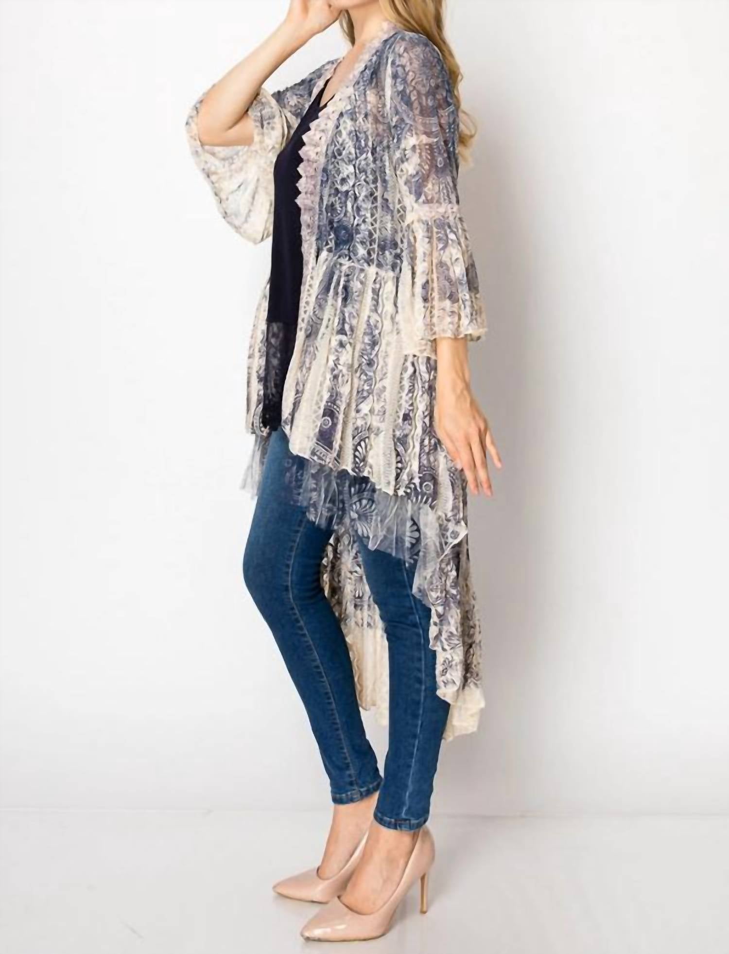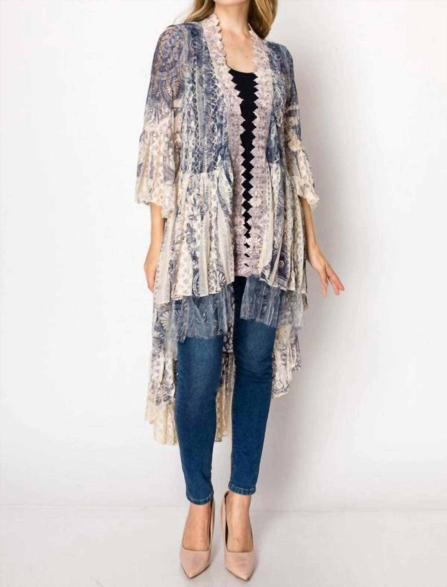 This cardigan will be a sweater-rotation favorite. Introducing the Ethereal Lace Kimono by Origami, a stunning short-sleeve cardigan layered with delicate lace in a multi-patterned design. Featuring a high-low hemline, this lightweight kimono offers a flowing silhouette, perfect for any summer ensemble. Its open-front pull-on style makes it ideal for versatile layering over casual or formal outfits. This elegant statement piece brings a dreamy touch to your wardrobe.