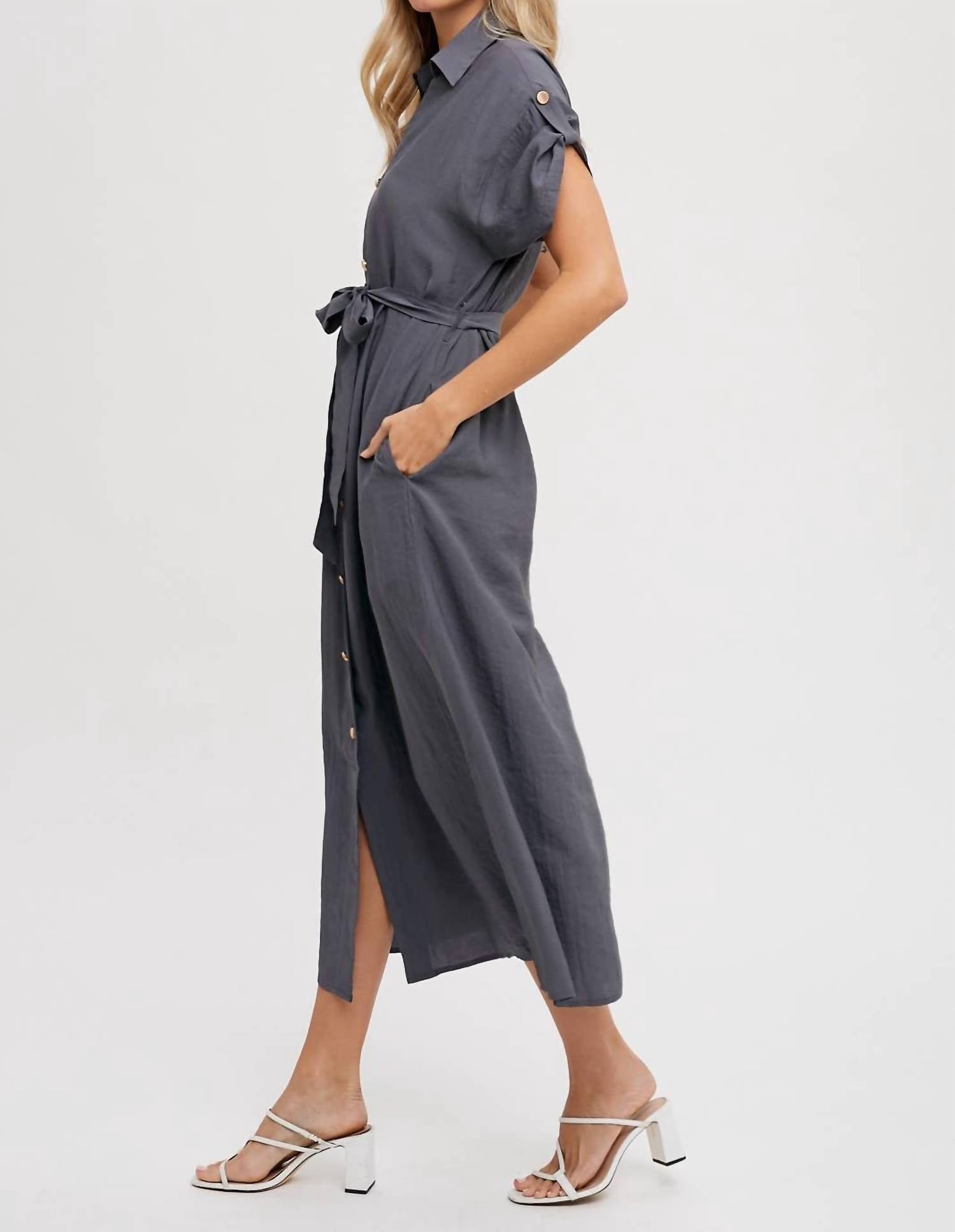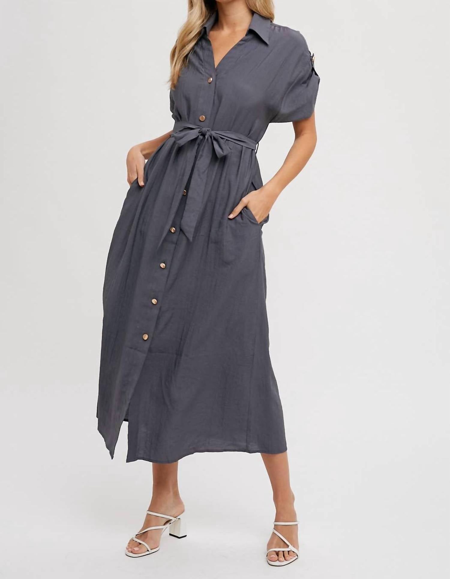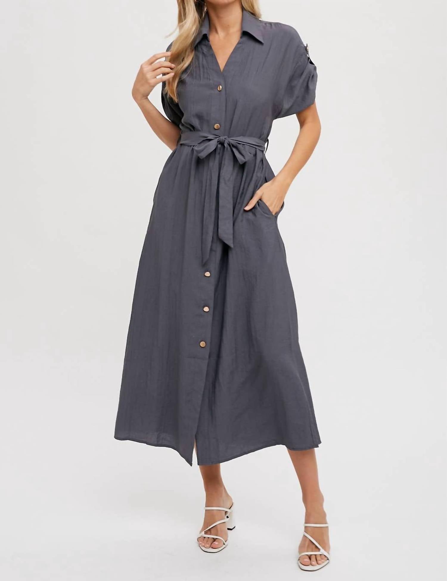 Just add slides or mules and you are good to go. Introducing the Belted Shirt Dress by BluIvy, a sophisticated staple in a solid ASH hue crafted from Rayon. This versatile dress features adjustable roll-tab short sleeves, allowing you to switch effortlessly from long to short sleeves, and includes a waist-cinching belt for a flattering silhouette. Originating from CN, it boasts a classic button closure and a chic collar neckline, enhanced by the practicality of pockets. To maintain its elegance, hand wash is recommended. Model is 5'9" and wearing a Small.