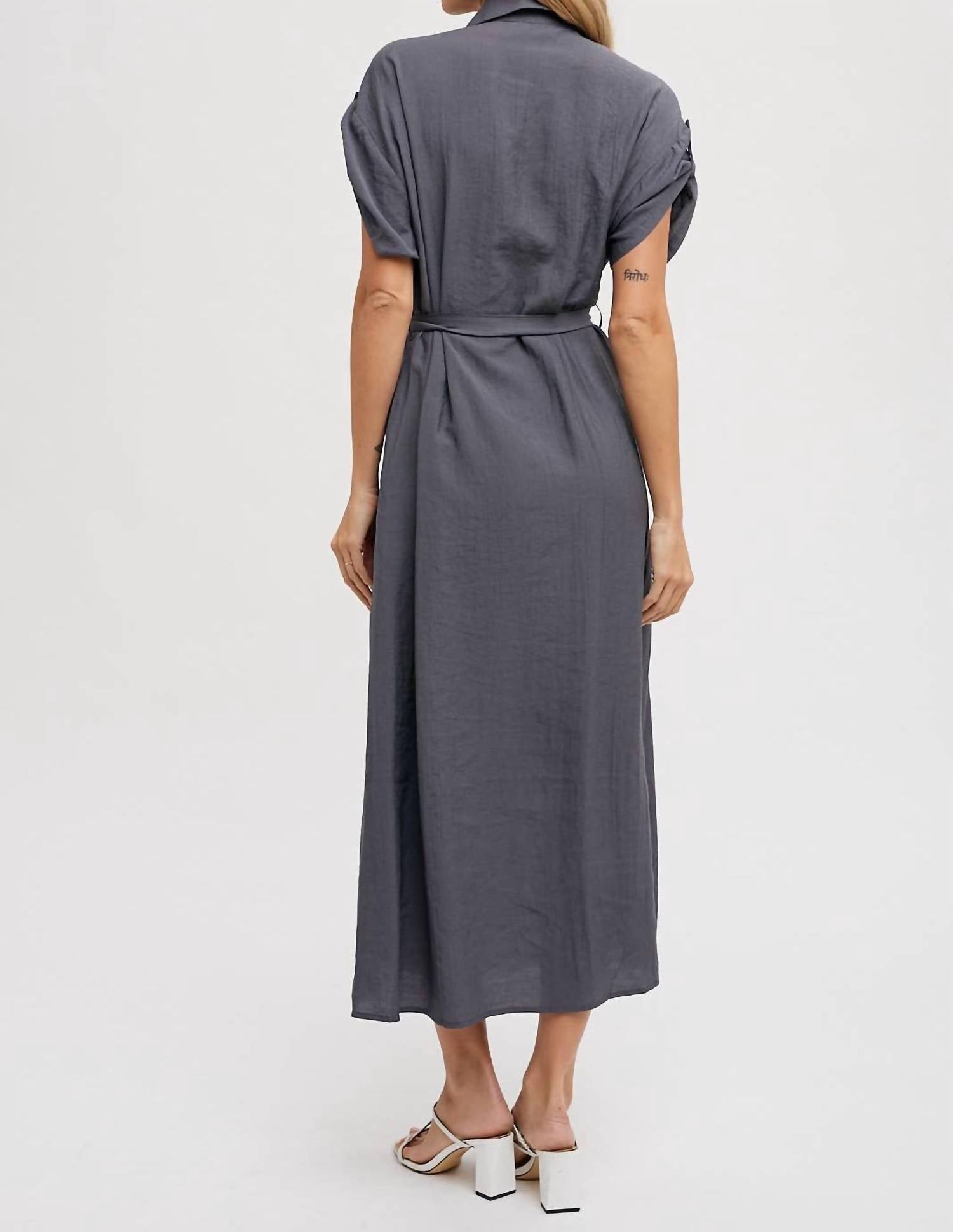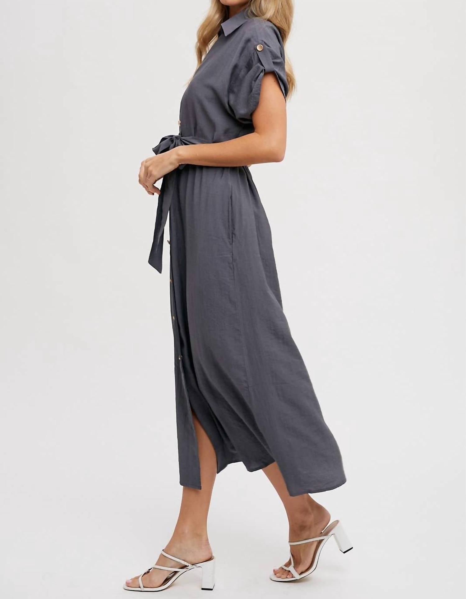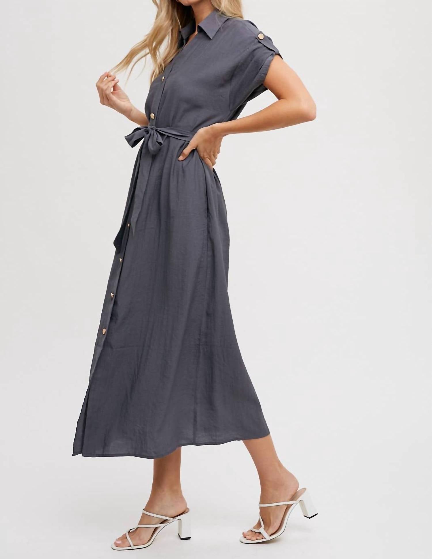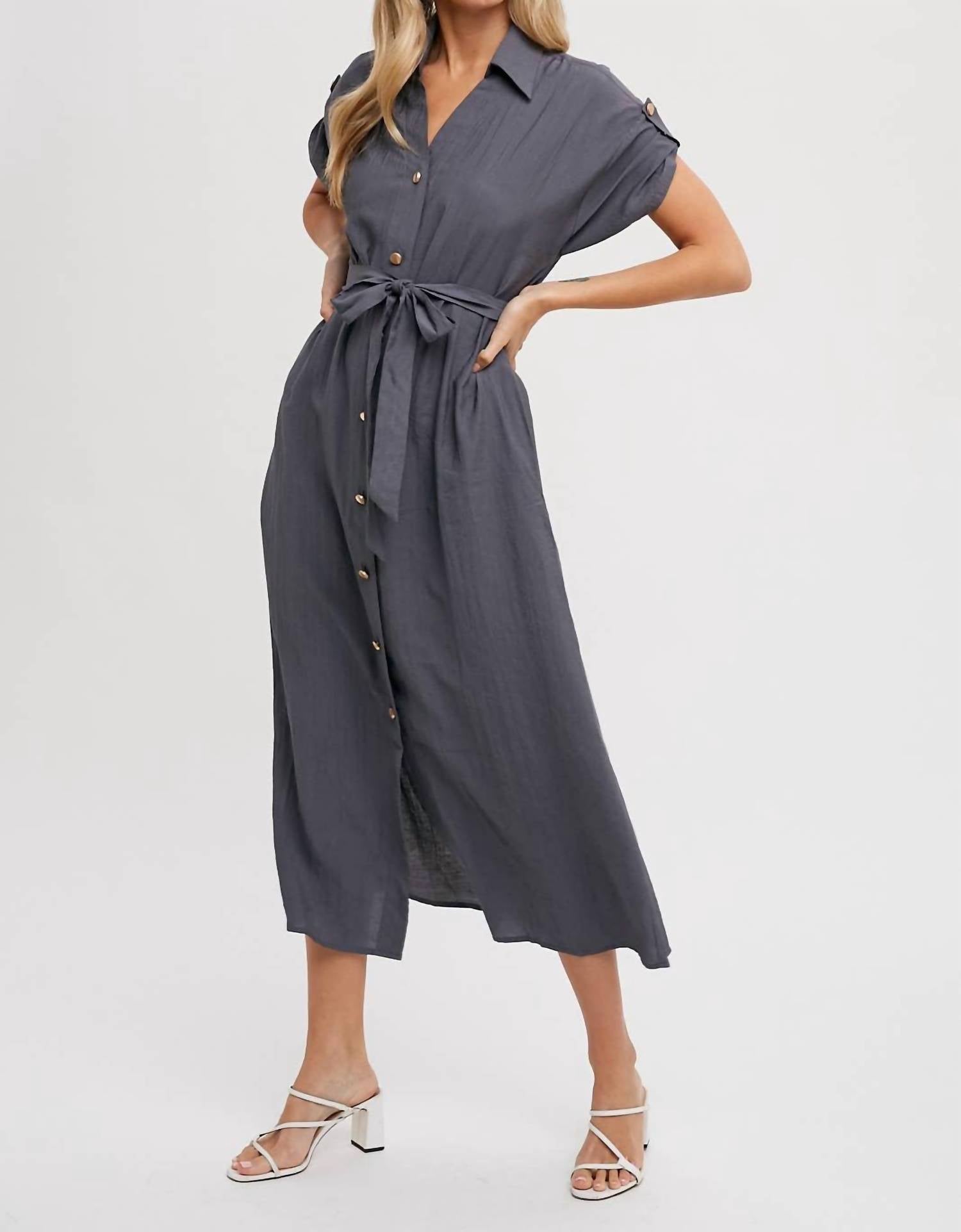 Just add slides or mules and you are good to go. Introducing the Belted Shirt Dress by BluIvy, a sophisticated staple in a solid ASH hue crafted from Rayon. This versatile dress features adjustable roll-tab short sleeves, allowing you to switch effortlessly from long to short sleeves, and includes a waist-cinching belt for a flattering silhouette. Originating from CN, it boasts a classic button closure and a chic collar neckline, enhanced by the practicality of pockets. To maintain its elegance, hand wash is recommended. Model is 5'9" and wearing a Small.