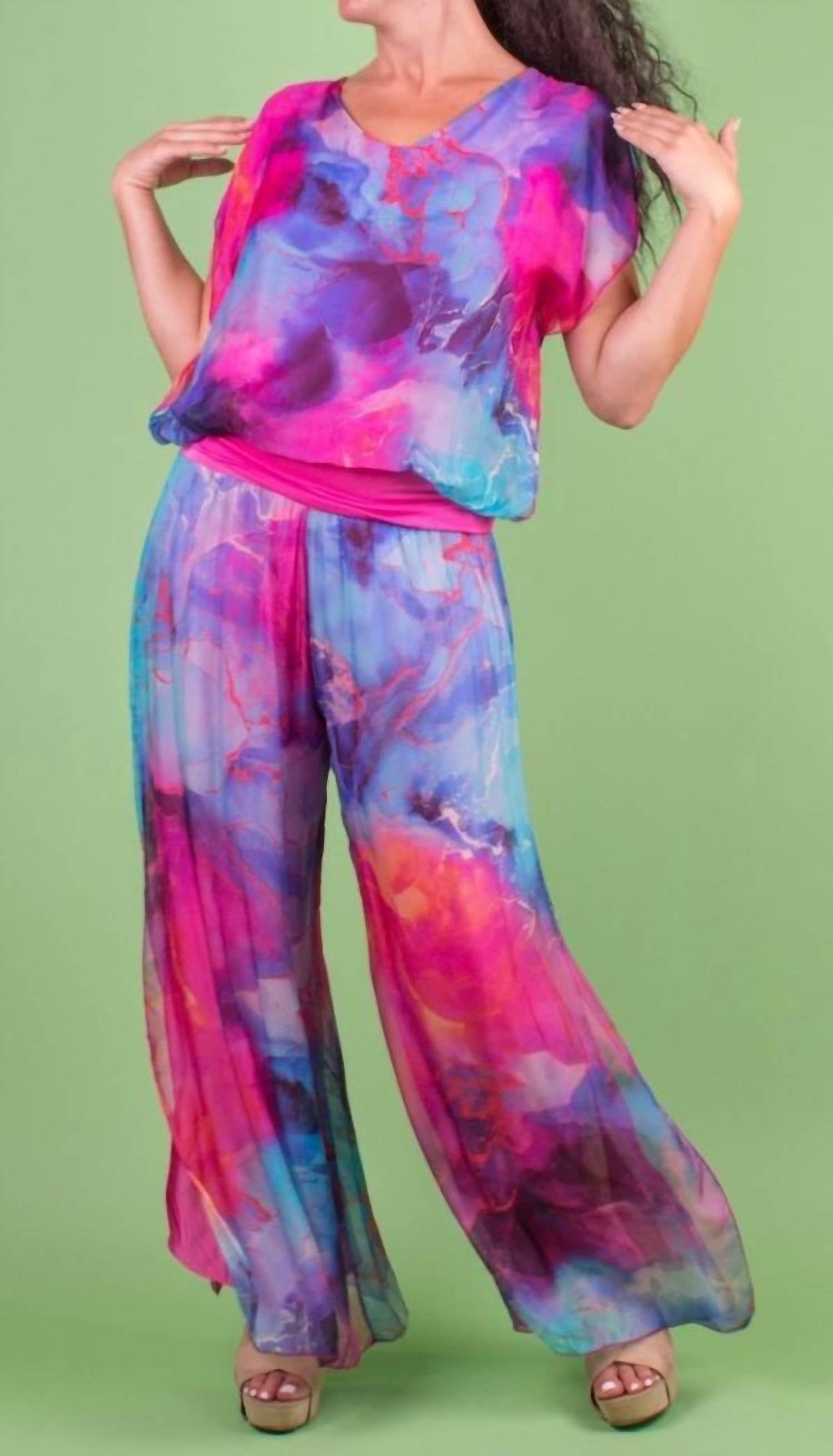 Elevate your wardrobe with the Jasmin Tempesta Slit Pant by GIGI MODA, a chic choice for bold style. These hot pink pants are crafted from 100% silk, featuring a stylish stormy print pattern and a comfortable elastic waistband. Completed with a side slit in the hem, the design adds a touch of flair to the wide-leg silhouette. Made in Italy, these one-size pants are perfect for women who appreciate luxurious, eye-catching attire.
