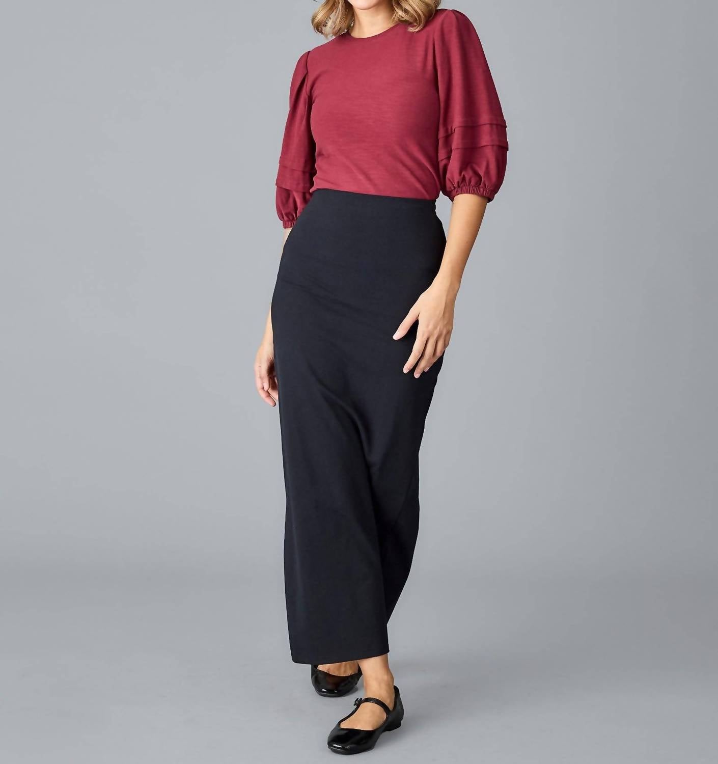 A timeless blouse that will never go out of style. Experience elegance with the Adagio Half-Sleeved Top by DOWNEAST, crafted in a rich Cabernet hue. This women's blouse showcases three-quarter balloon sleeves with charming ruffle details, delivering a sophisticated yet playful look. With a garment length of 23.5" from shoulder to hem in the back, it features a pull-on closure for easy wear. Care for this piece is effortless: simply machine wash and tumble dry.