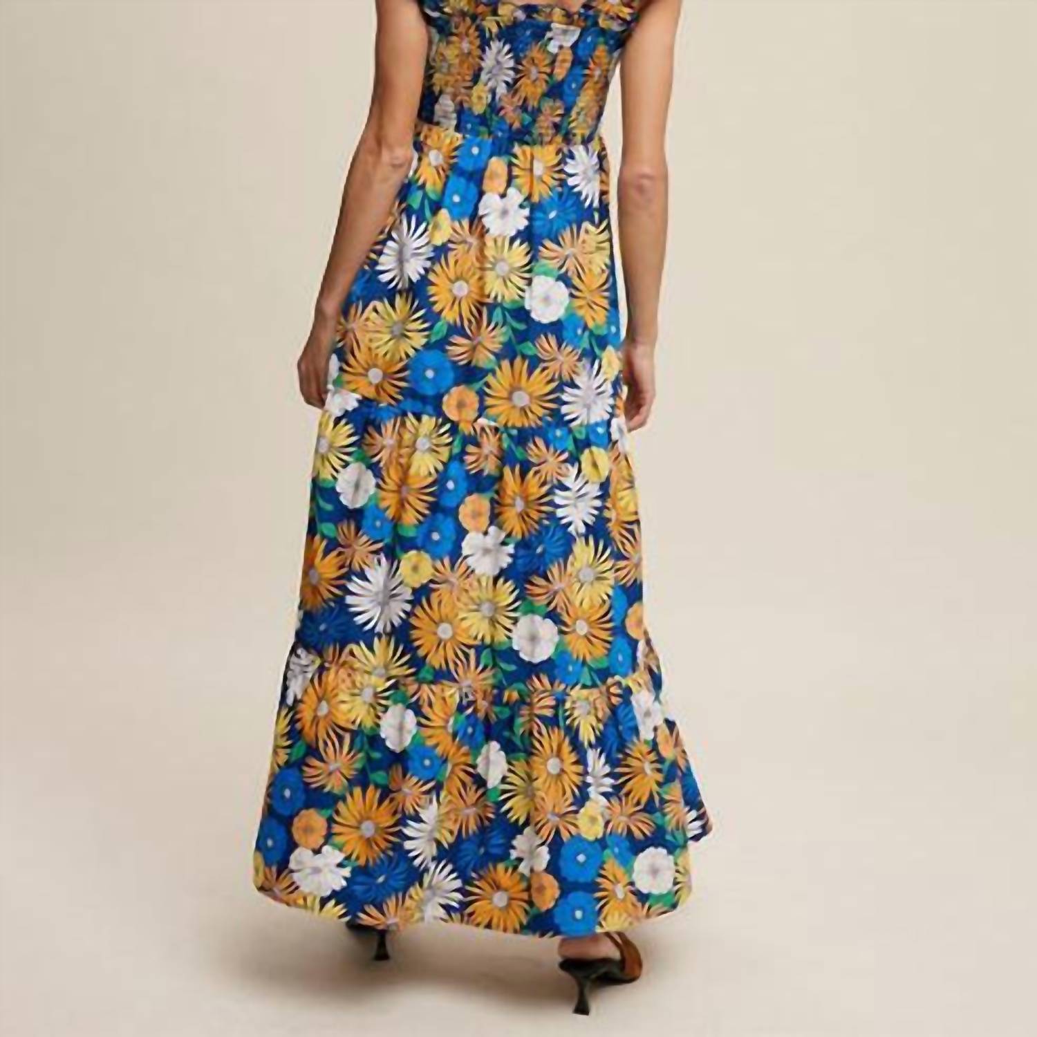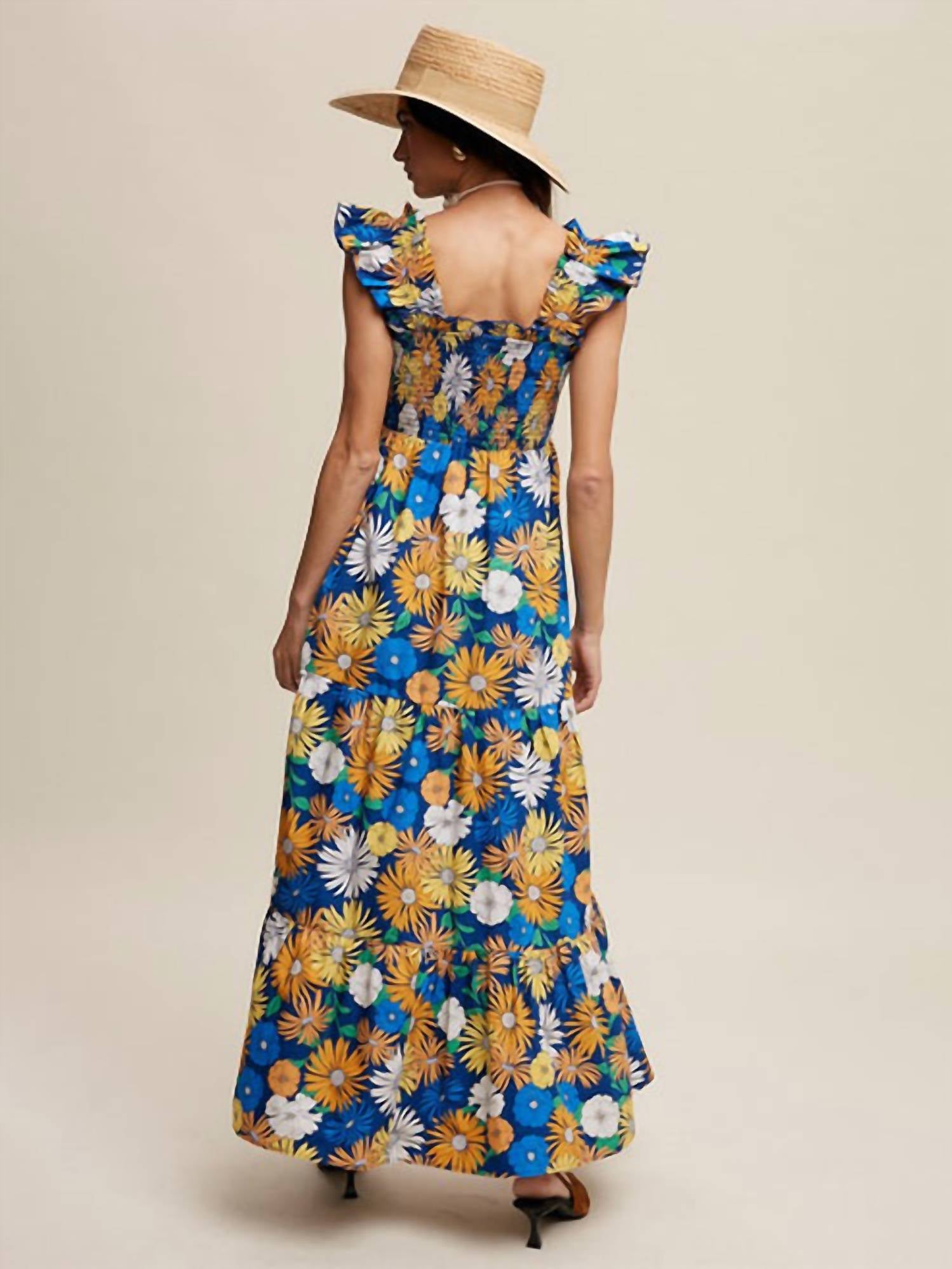 Ruffled sleeves. Maxi length dress. Floral print allover. Square neckline. 100% cotton.