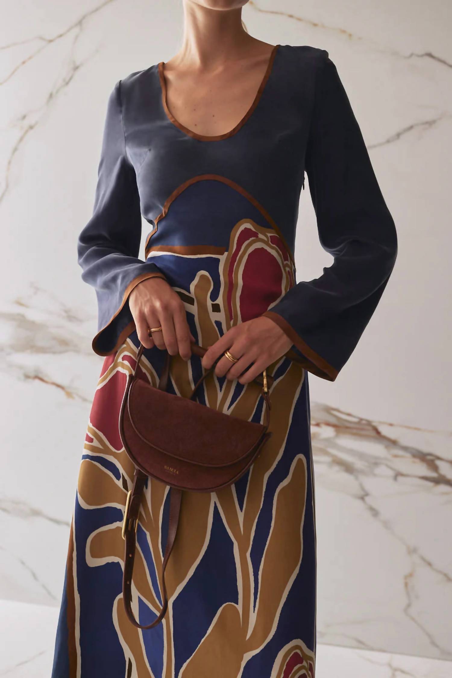 A maxi dress that is just as cute as it is comfortable. Introducing the Rosalind Maxi Dress by Sancia, an exquisite choice for chic event wear. This dress features long wide sleeves, perfect for cooler seasons, and showcases a sophisticated A-line silhouette with a vibrant Lisse Tulip Print. Crafted from our favorite cupro blend, it offers a scoopneck design and a convenient pull-on closure. Ideal for maximalist trend lovers, this piece is designed for evening events.