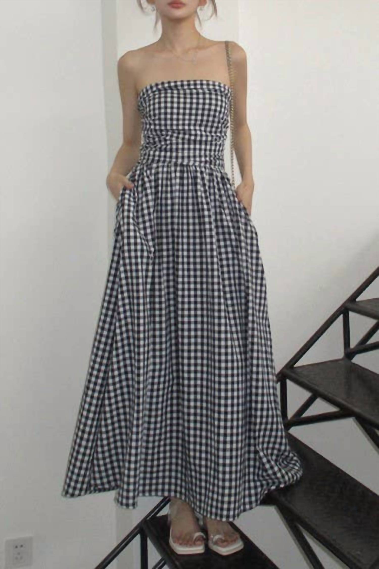 Rosa Clothing - Minimalist Gingham Strapless Flare Maxi Dress