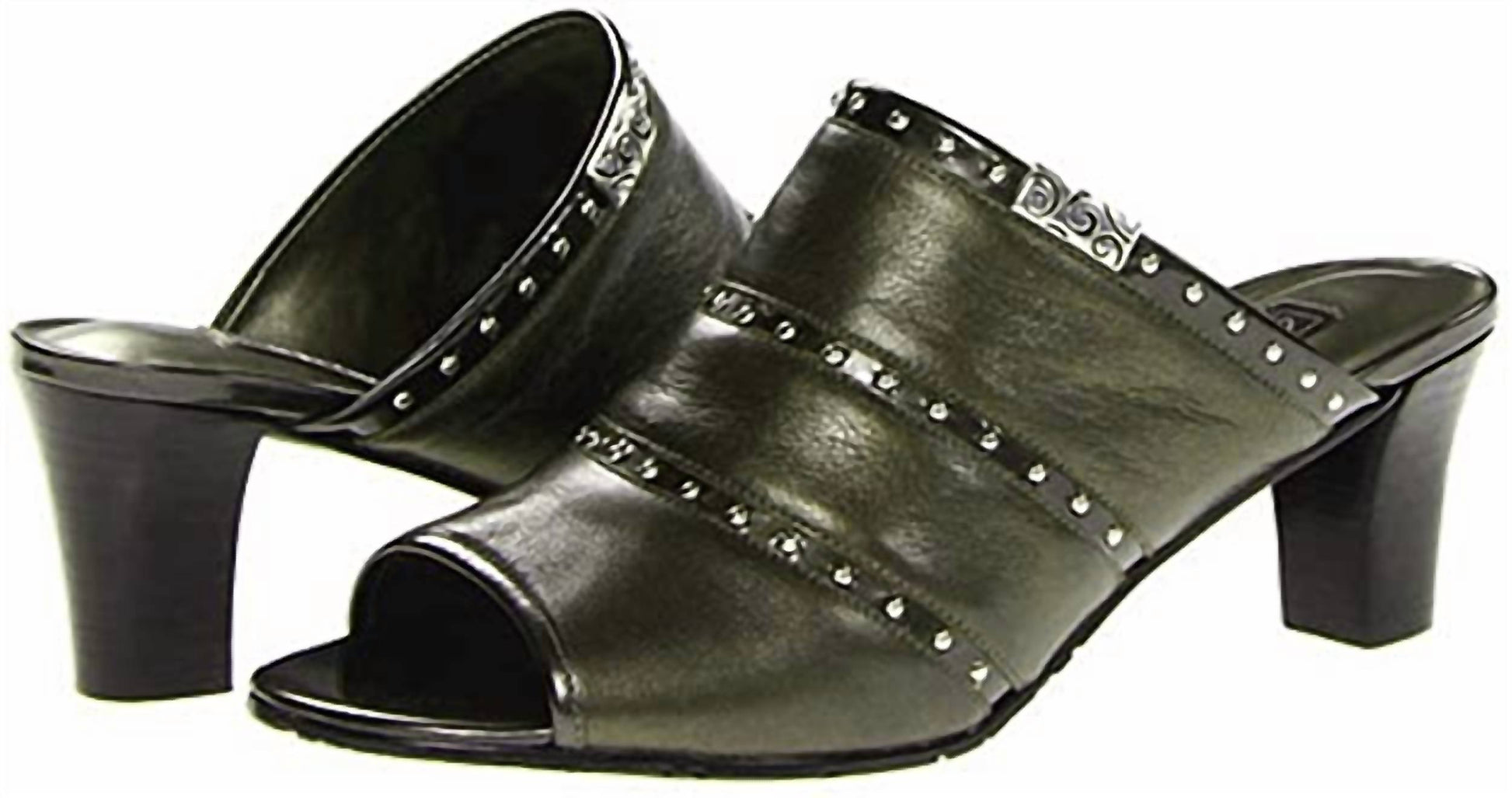 2 1/2" heel. Slip on. Silver Rivets accent