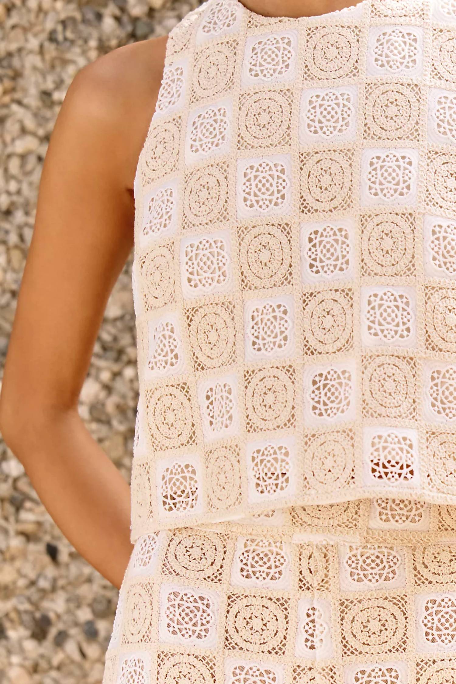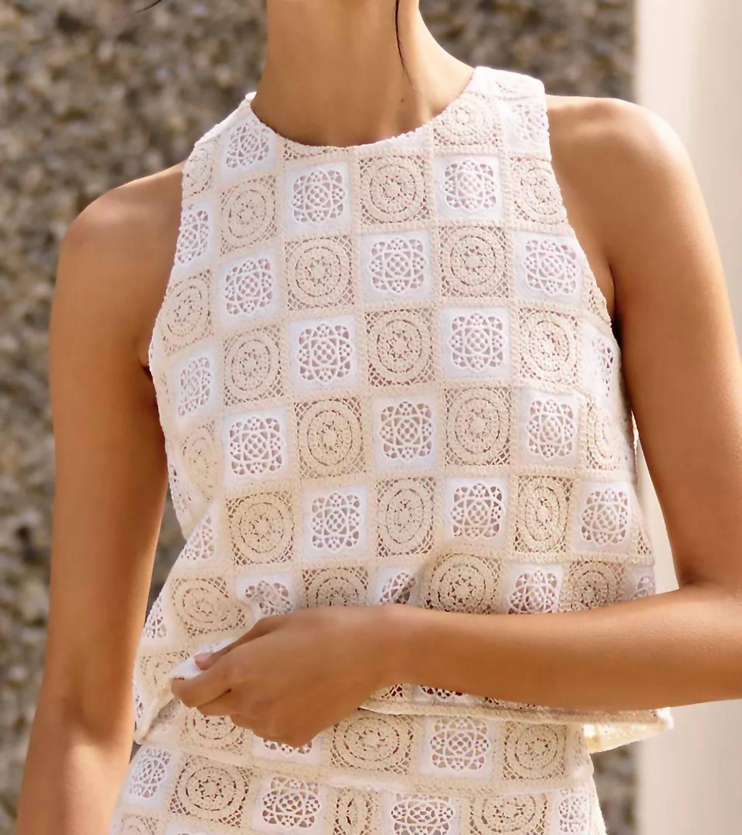 Pair this crop top with your favorite high-waisted jeans or maxi skirt. Elevate your summer wardrobe with the Bowie Top by Sundays, a chic addition for any vacation look. This cream crochet crop top is crafted from textured polyester, offering both style and comfort. With a crewneck design, it’s a sleeveless essential that channels a boho chic vibe. Easy to wear, it features a pull-on closure and can be easily maintained with machine wash.