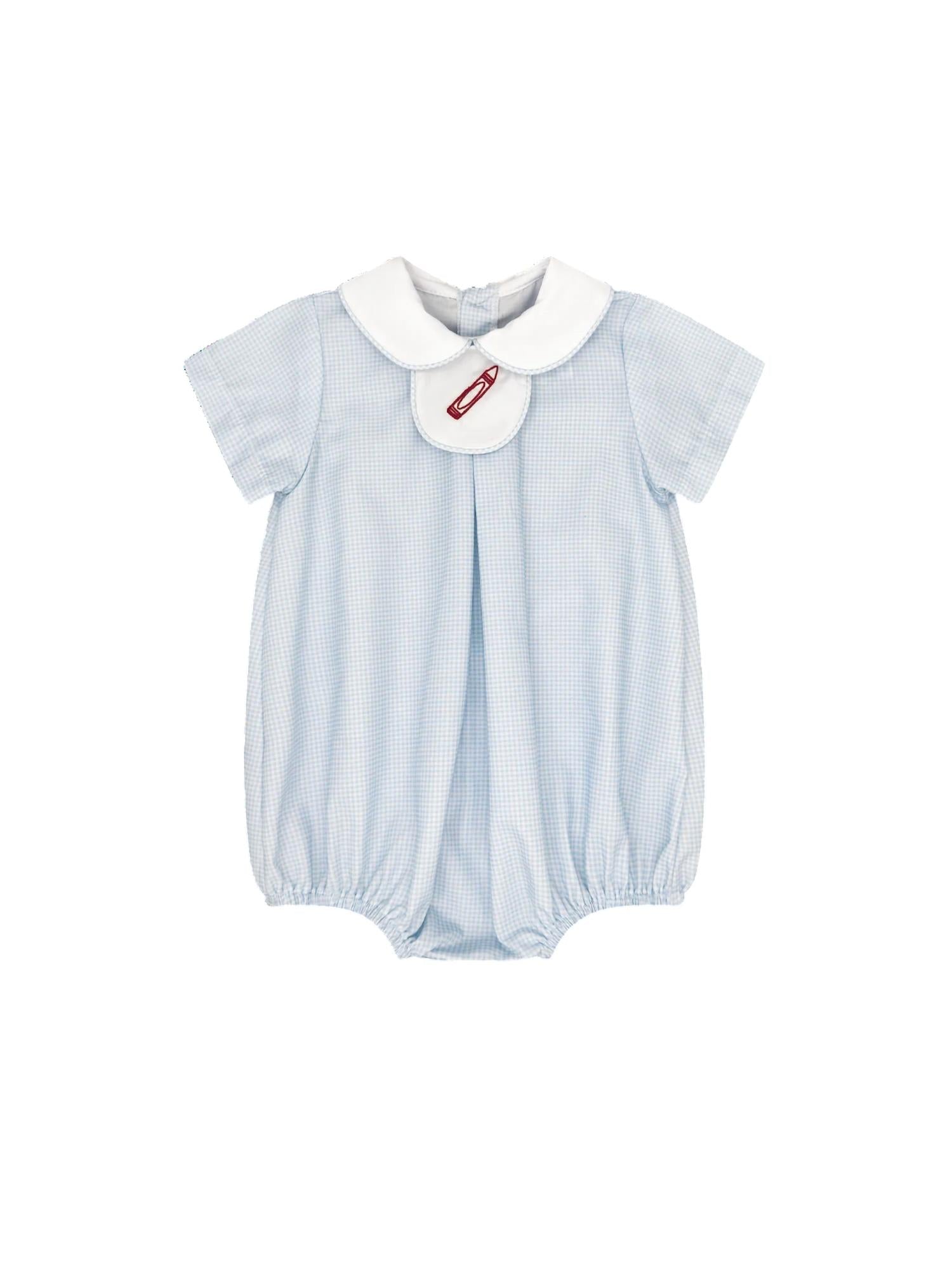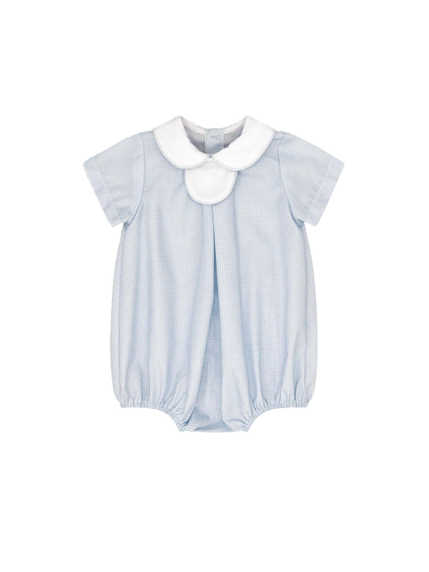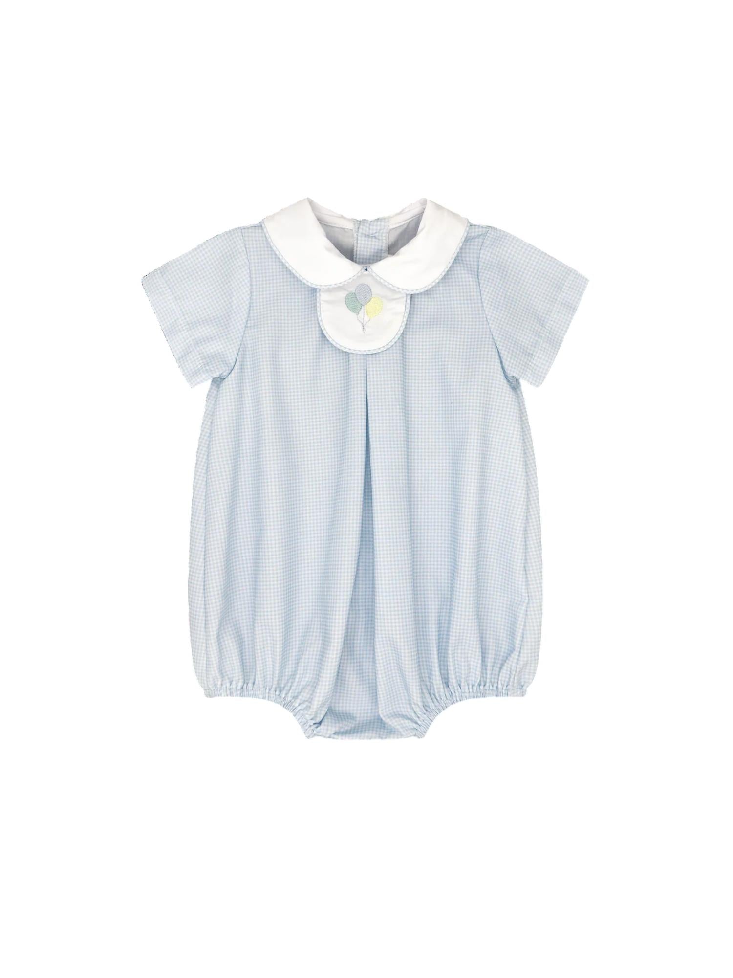 Discover the Lullaby Set's Boy's Thomas Tab Bubble Romper, an adorable choice in Baby Blue Minigingham crafted from soft cotton for your little adventurer. Designed with a vintage gingham pattern, this romper is perfect for spring travel and Thanksgiving festivities. Specially tailored for boys, it includes interchangeable tabs—a back to school tab, a birthday cake tab, and a blank tab for personalized style. Wash and dry instructions are not provided.