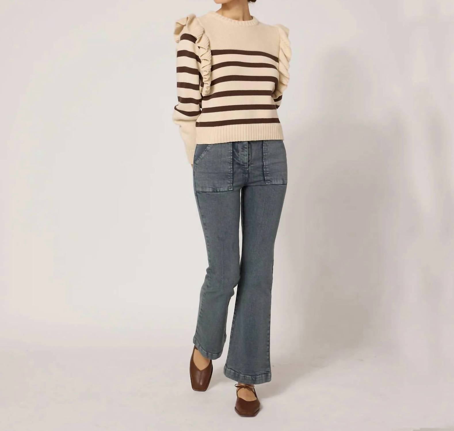 This cream long sleeve cardigan is crafted from 100% organic cotton yarn and features classic stripes with a unique ruffle detail at the shoulder. Ethically handmade in India and finished with a V-neck and three-button closure down the center front, it’s both ethical and elegant. Care for it by hand washing in cold water, laying flat to dry, or opting for dry cleaning.