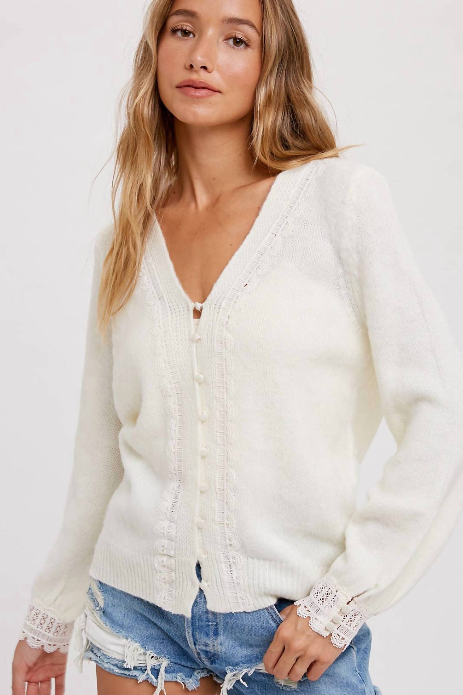 Elevate your wardrobe with the Lace Trim Button Up Pullover by BluIvy in an elegant ivory shade. Featuring long sleeves and a V-neck, this pullover is crafted from soft acrylic, ensuring comfort and style. The button closure and delicate lace trim add a feminine and polished touch to this textured top, perfect for both work and leisure. Proudly made with timeless appeal, it seamlessly transitions between seasons, complementing a variety of outfits.