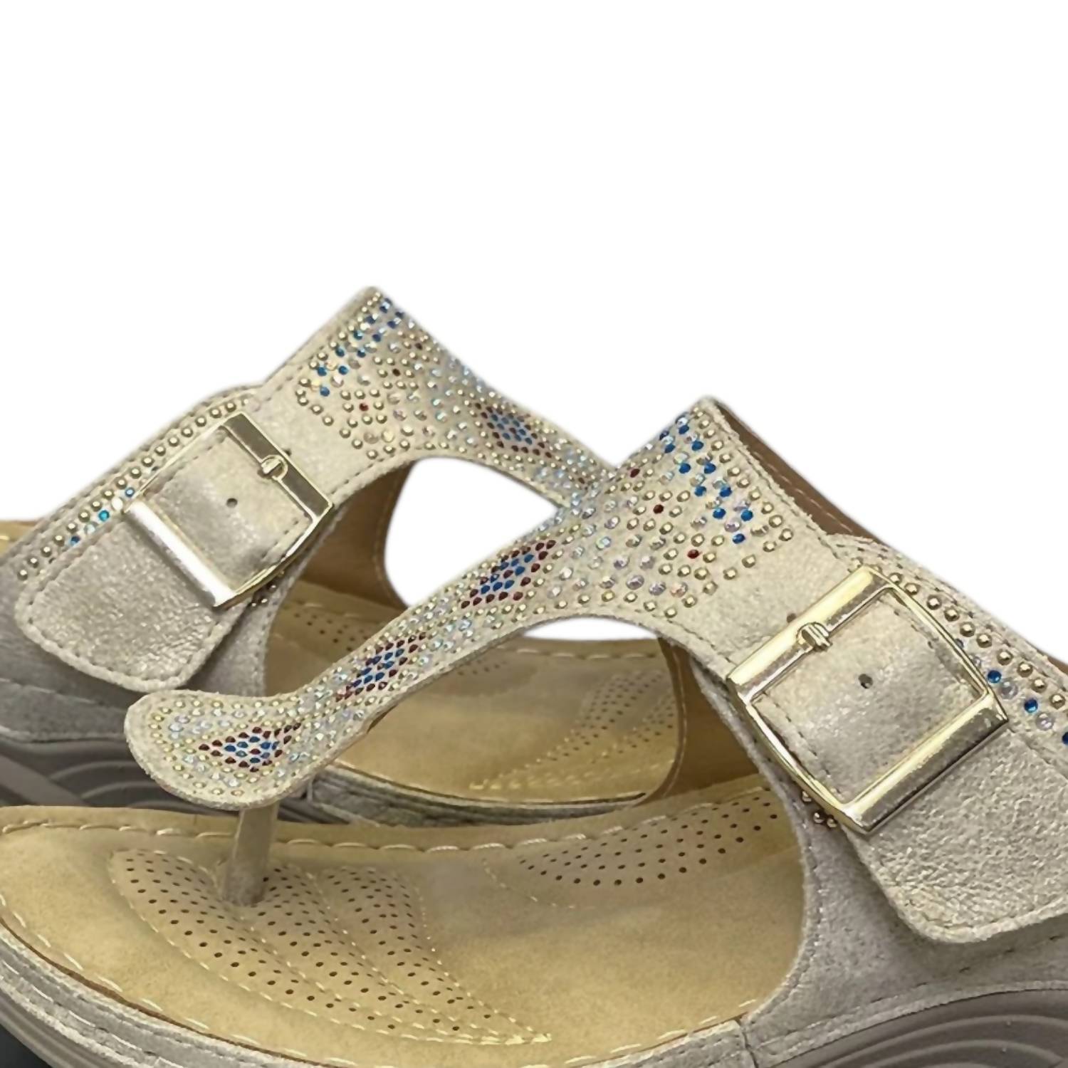 Elevate your footwear game with these adorable wedges. Step into sunny days with the Women's Jett Set Sandal by Corkys Footwear, where an embellished motif adds a touch of glam to your warm-weather adventures. Designed with an open toe and a comfortable wedge heel, these gold sandals offer both style and comfort. Perfect for adding a sparkle to your stride, they're an ideal choice for any casual outing. Made for adult women, these sandals are as stylish as they are supportive.