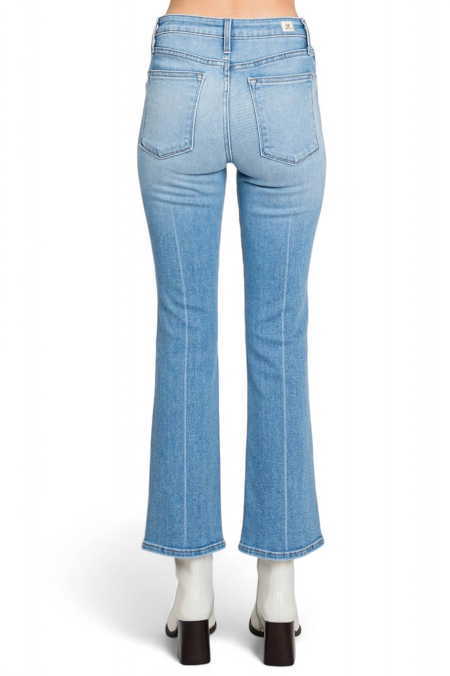 These cropped jeans feature a flared silhouette with a clean hem and a classic 5-pocket design. They have a button closure with a zip fly and include fading details for a stylish touch. Made from a blend of cotton, polyester, and spandex, they should be machine washed cold. The rise is 10 inches, and the inseam measures 27 inches.