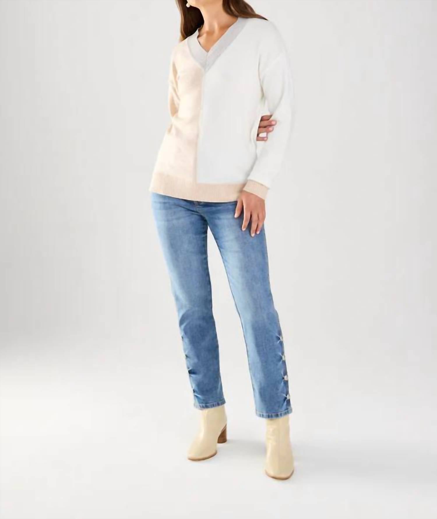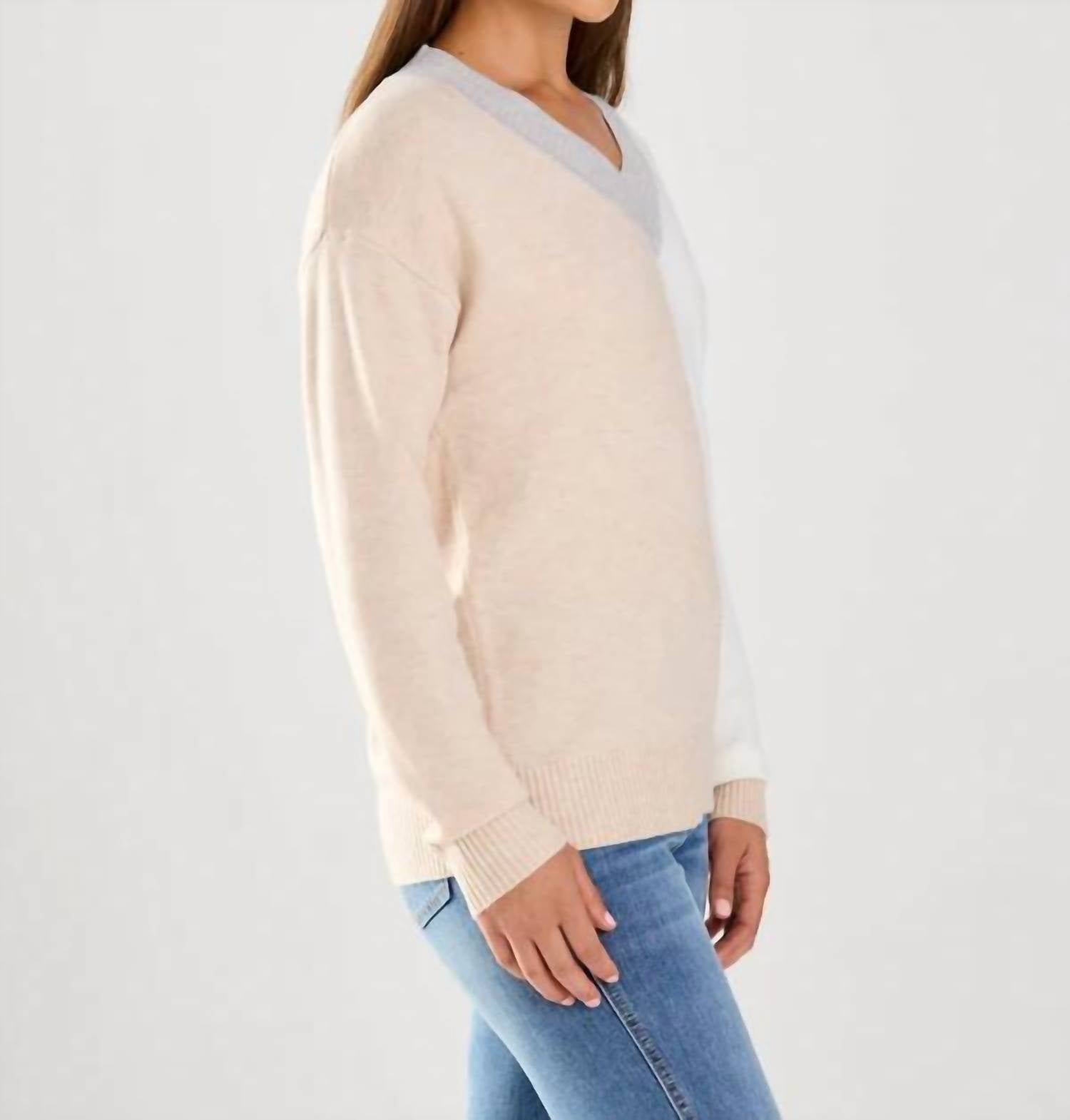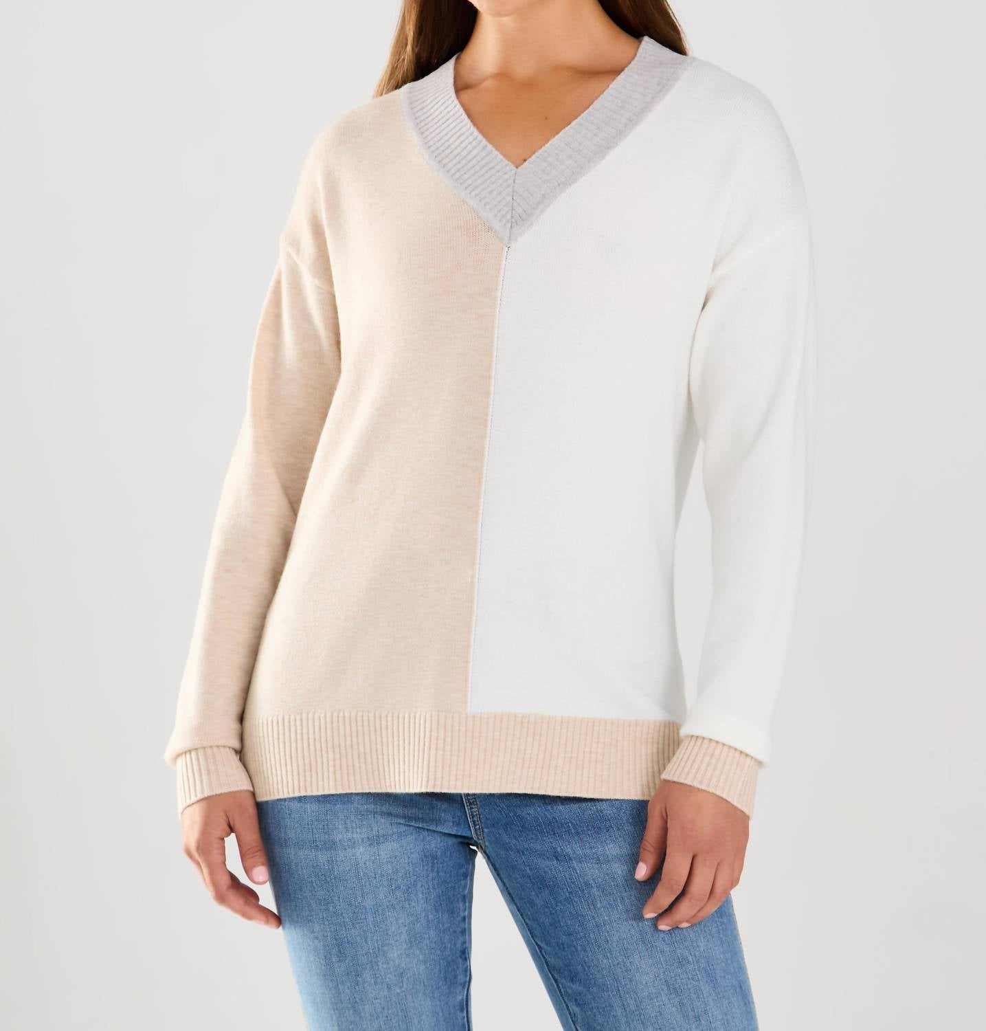 You'll be reaching for this comfy and classic v-neck sweater all season long. Elevate your wardrobe with the FDJ Color Block Sweater, a chic addition to your collection in an elegant Oatmeal/Ivory palette. This women's sweater features long sleeves and a flattering V-neckline, offering a touch of sophistication to your ensemble. Crafted from durable polyester, it measures 25 inches in length and is perfect for layering or wearing on its own. Designed with a convenient pull-on closure for easy wear, this solid pattern sweater brings style and comfort together effortlessly.
