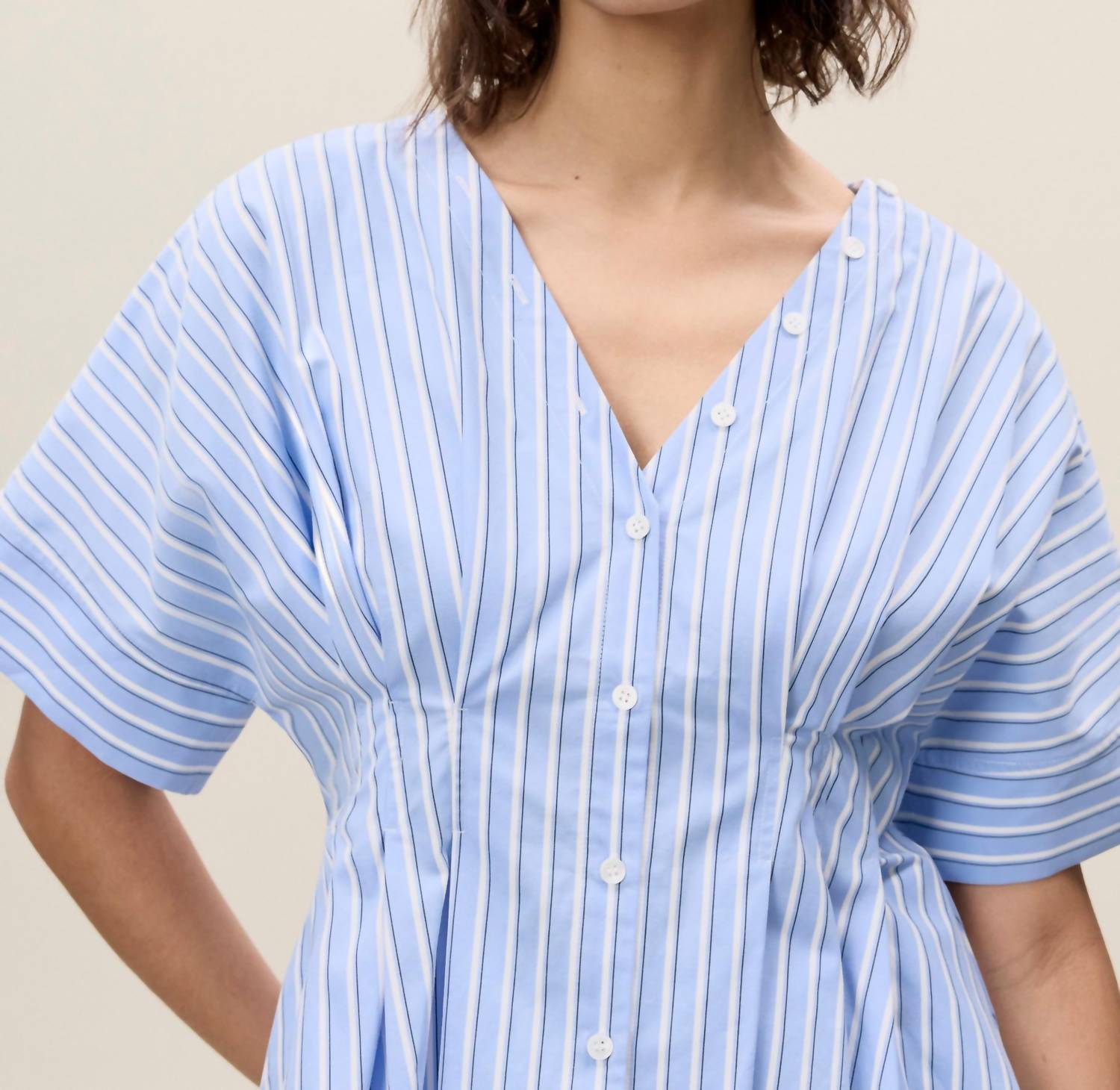 A timeless blouse that will never go out of style. Experience casual sophistication with the Priya Poplin Top by Rebecca Taylor, a masterpiece in blue stripes that embodies urban chic. Designed with short sleeves and premium cotton fabric, this top is both lightweight and breathable. Featuring a front button closure and V-neck, the top presents polished elegance in every detail. Care instructions specify dry cleaning for maintaining its pristine look.