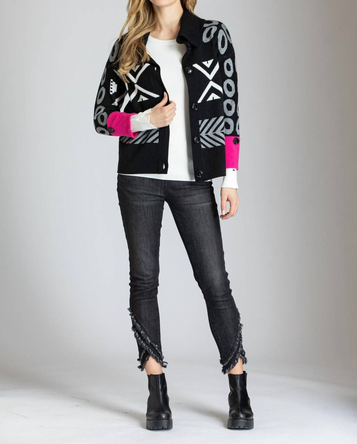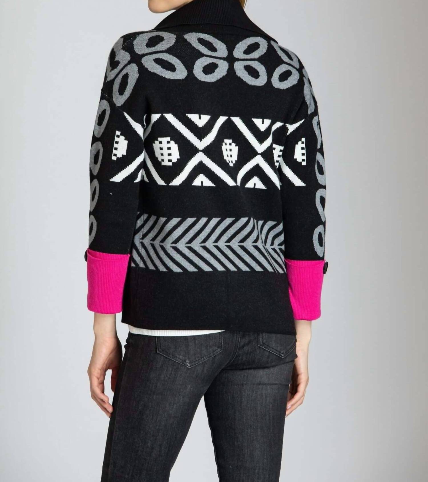 This cardigan will be a sweater-rotation favorite. Meet the Nordic Cardigan by APNY, a vibrant addition to your collection with its playful black and pink geometric design. This piece features long sleeves with adorable button details and a versatile collar neckline that can be styled both open or closed. Crafted for women, it's the perfect combination of practicality and fun flair.