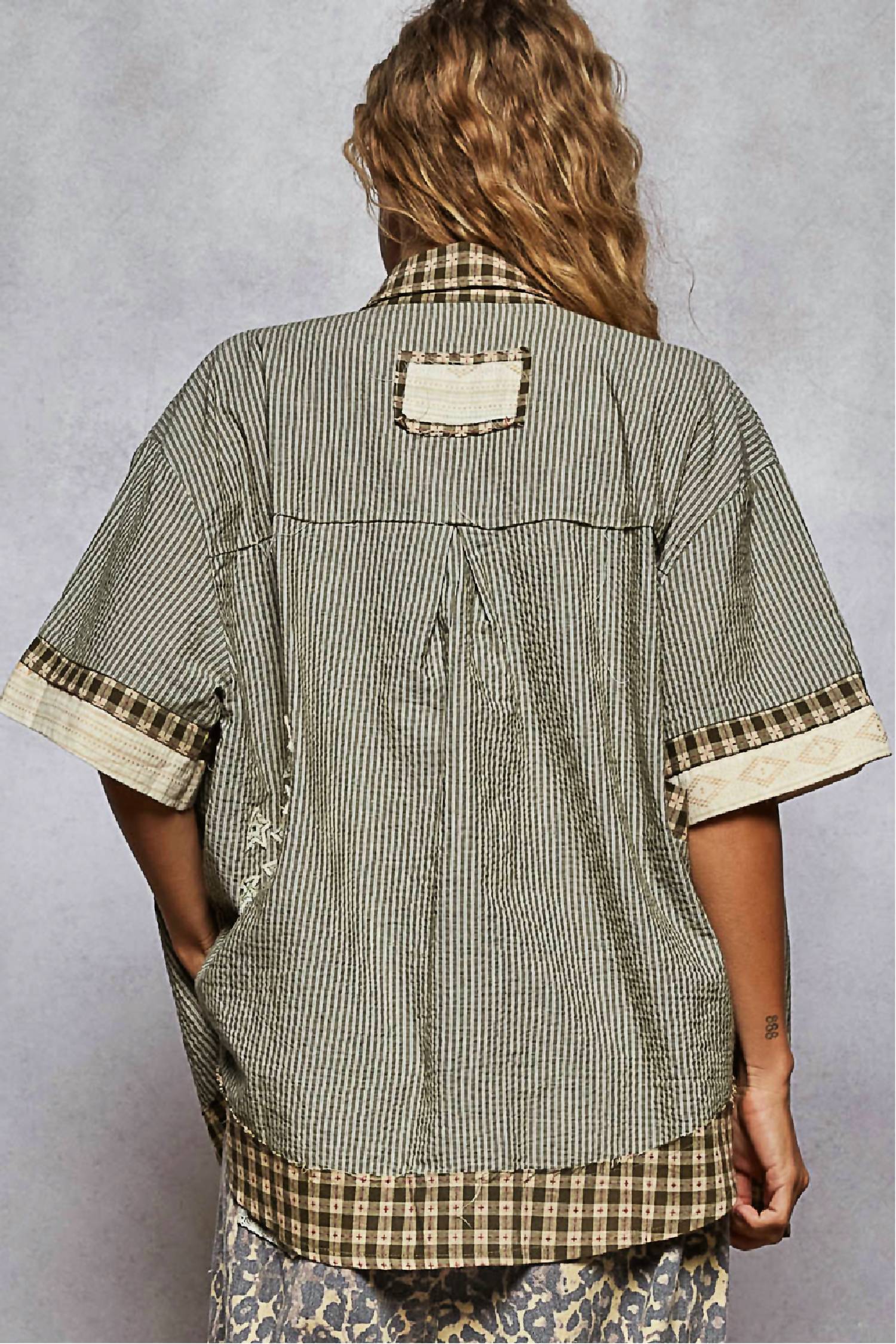 Perfectly tailored and soft to the touch. This shirt is all about bold and playful vibes! Featuring a roomy short-sleeve fit with a mix of textures and prints in woven patchwork, plus chest and side patch pockets adorned with floral accents and a stylish back pleat. Perfect for laid-back, funky looks—team it up with shorts, leggings, or your go-to denim for a boho or quirky casual style! - 100% COTTON Fit runs large - size down for a closer fit