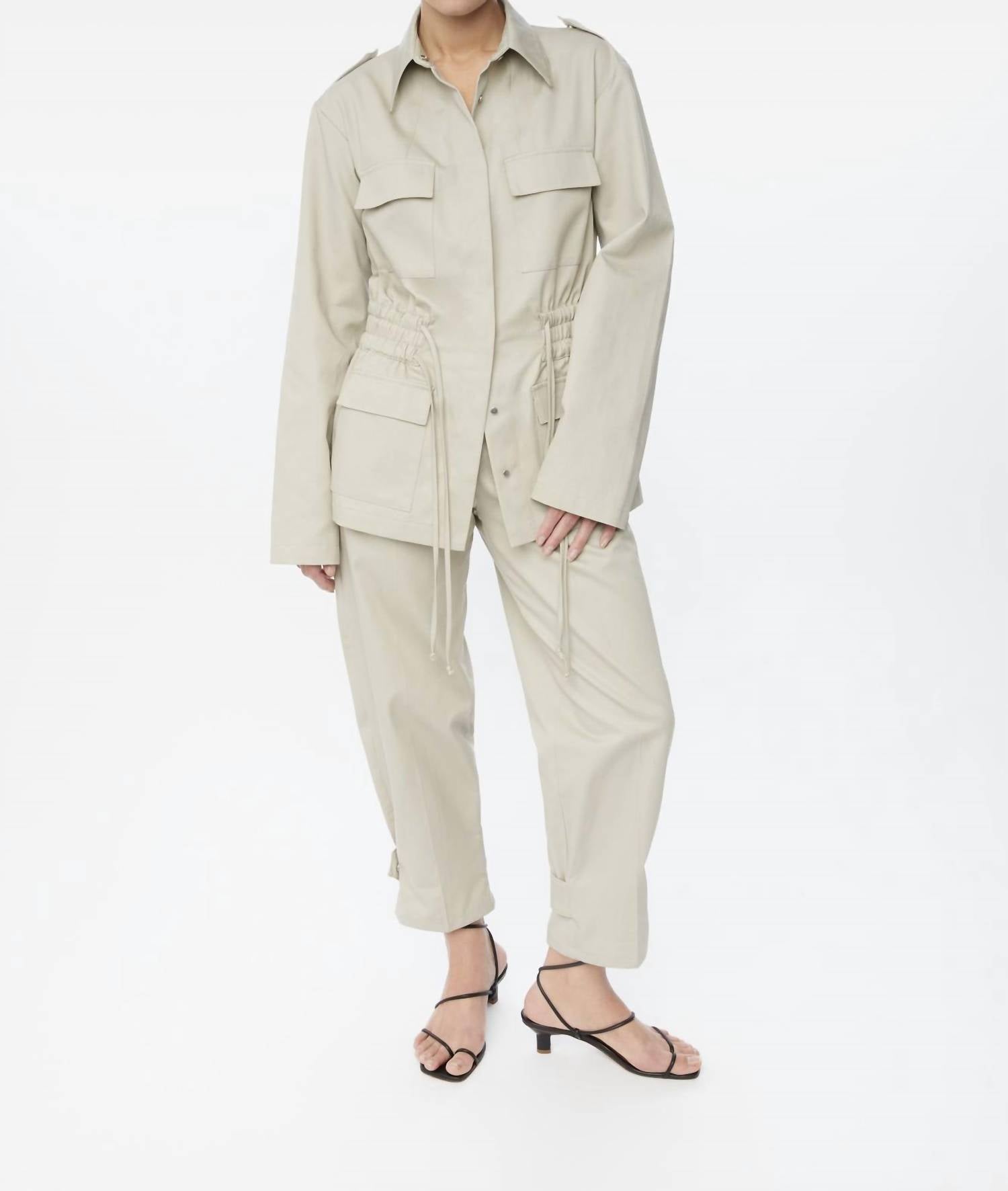 The ultimate cool-girl utility jacket. Introducing the Canvas Cotton Utility Jacket by Dāl the Label, a stylish stone-colored piece perfect for any occasion. Crafted in pure cotton with long bell sleeves, this jacket offers both style and functionality with its supportive structure and hidden snap closure. The utility jacket features front flap pockets and an adjustable waist tie for a customizable fit. Care instructions include tumble drying to maintain its pristine condition.
